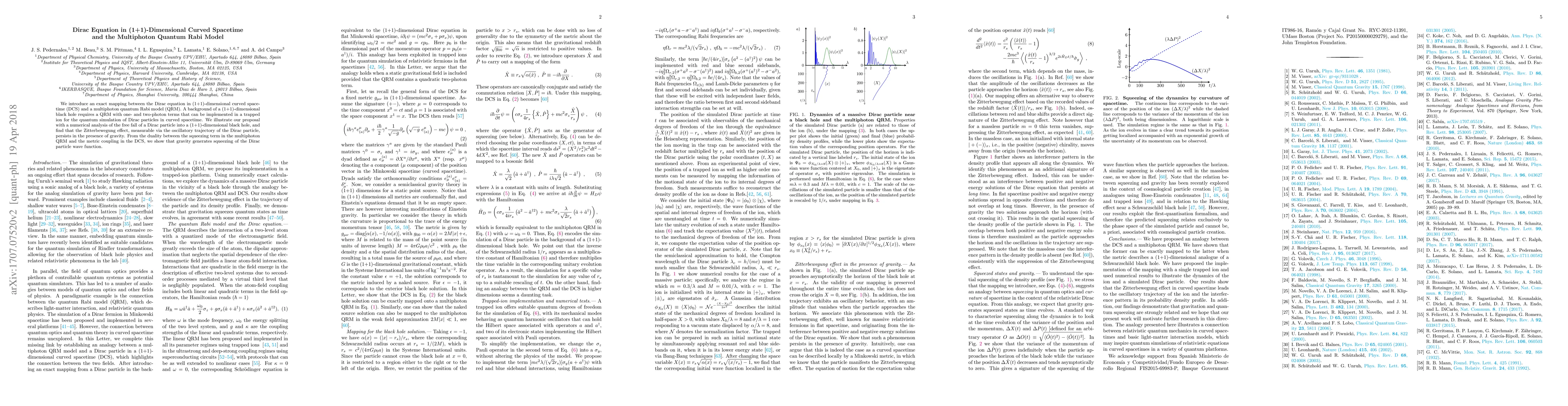This paper establishes an exact mapping between the Dirac equation in (1+1)-dimensional curved spacetime and a multiphoton quantum Rabi model, demonstrating that a black hole background requires a QRM with one- and two-photon terms. The study shows that the Zitterbewegung effect persists in curved spacetime and gravity induces squeezing of the Dirac particle wave function.