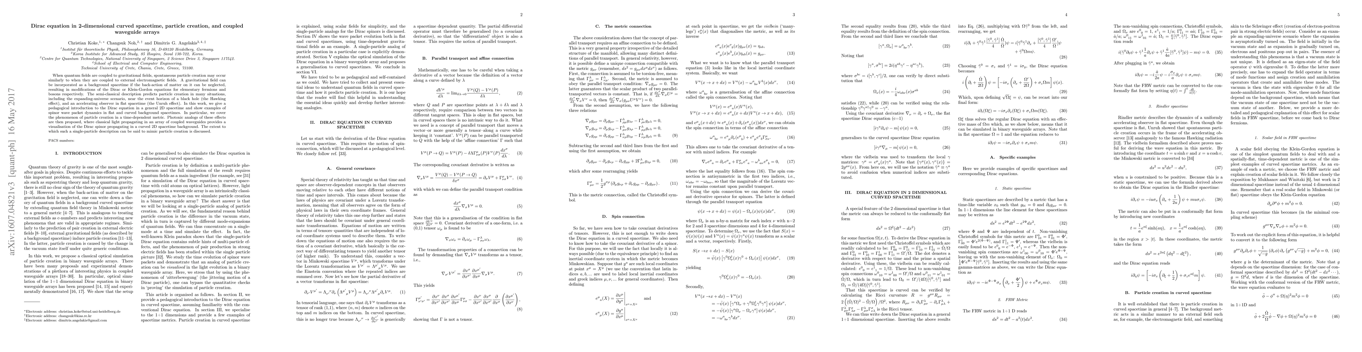 This paper provides a pedagogical introduction to the Dirac equation in 2D curved spacetime, demonstrating particle creation phenomena and comparing them to photonic analogs in coupled waveguide arrays. It explores the effects of gravitational fields on quantum fields and visualizes these effects using classical light in waveguide networks.