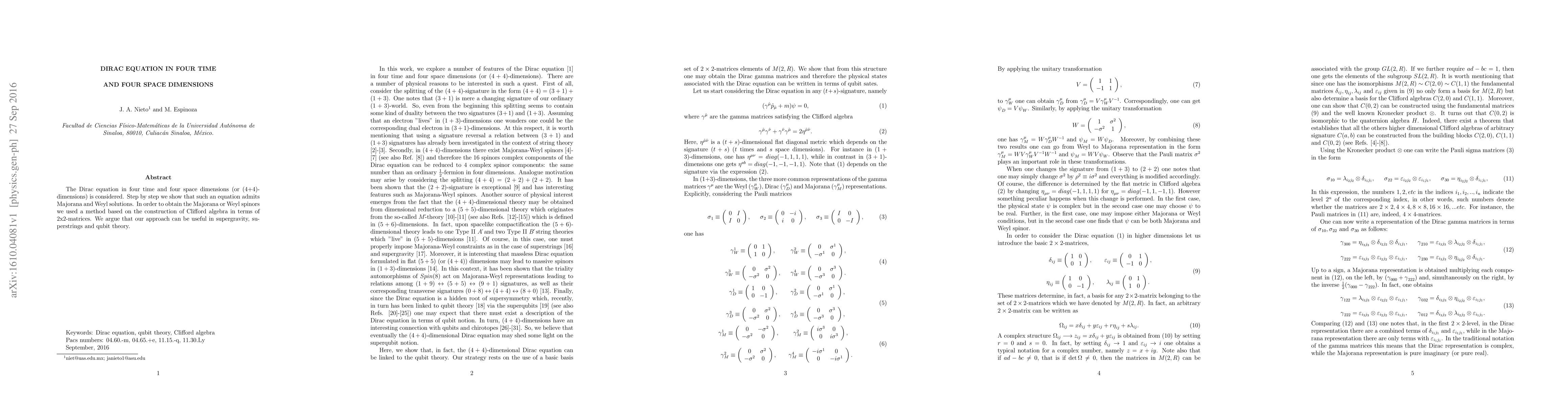 This paper explores the Dirac equation in (4+4)-dimensional spacetime, demonstrating the existence of Majorana and Weyl solutions through a Clifford algebra method. The proposed approach is suggested to have applications in supergravity, superstrings, and qubit theory.