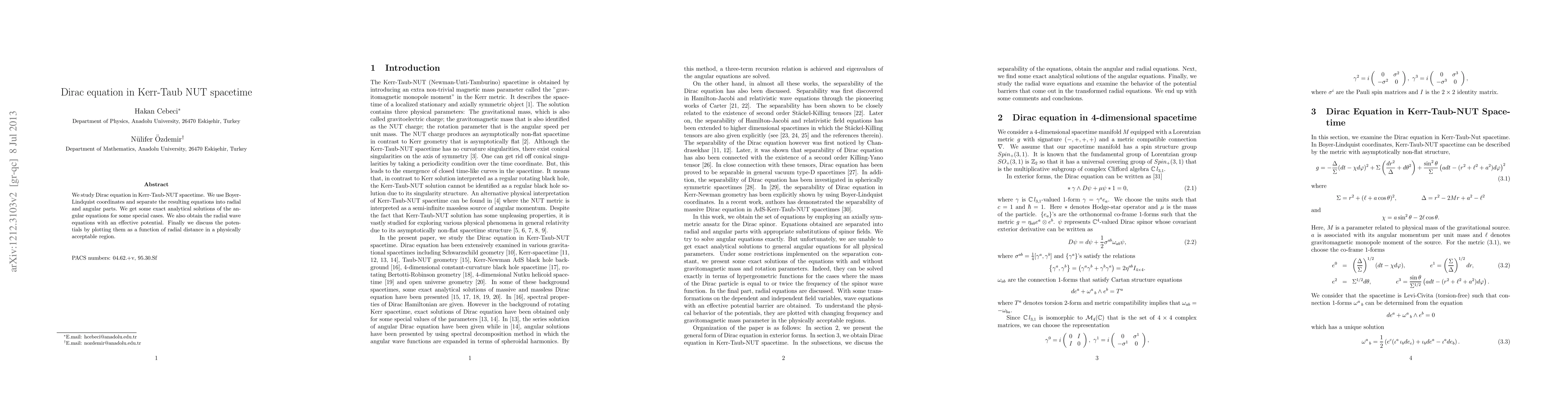 This paper investigates the Dirac equation in Kerr-Taub-NUT spacetime, separating it into radial and angular components, and deriving exact analytical solutions for the angular part under special conditions. The study also presents radial wave equations with an effective potential and discusses these potentials graphically.
