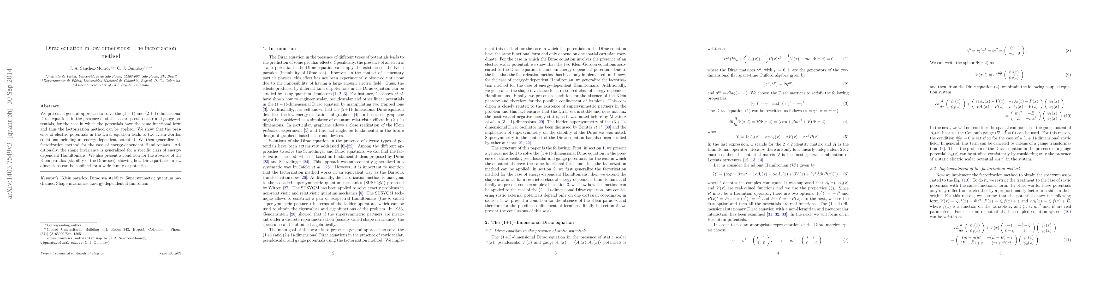 We present a general approach to solve the (1+1) and (2+1)-dimensional Dirac equation in the presence of static scalar, pseudoscalar and gauge potentials, for the case in which the potentials have the same functional form and thus the factorization method can be applied. We show that the presence of electric potentials in the Dirac equation leads to a two Klein-Gordon equations including an energy-dependent potential. We then generalize the factorization method for the case of energy-dependent Hamiltonians. Additionally, the shape invariance is generalized for a specific class of energy-dependent Hamiltonians. We also present a condition for the absence of the Klein's paradox (stability of the Dirac sea), showing how Dirac particles in low dimensions can be confined for a wide family of potentials.