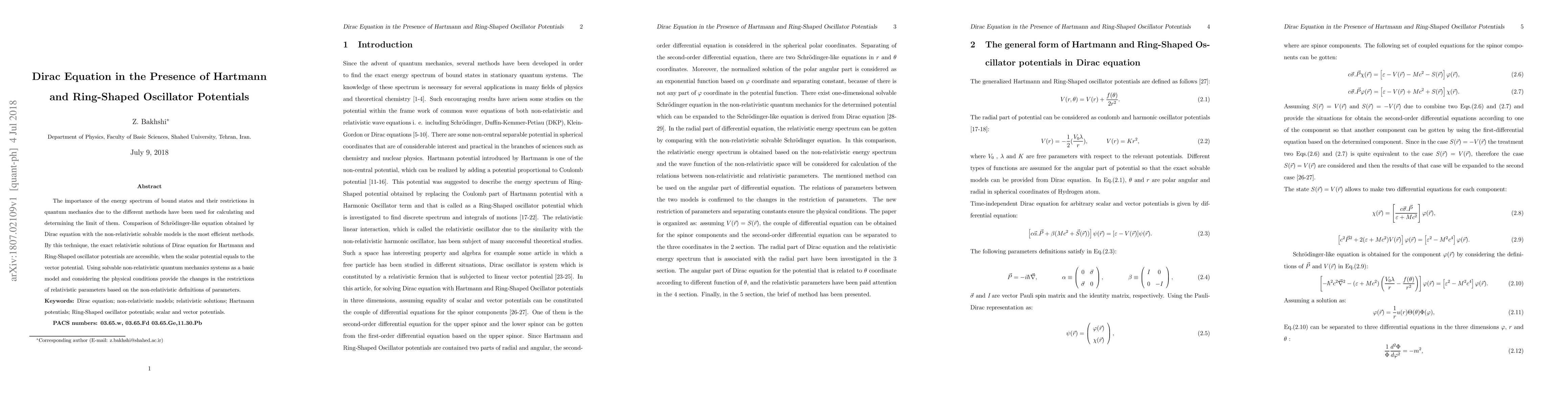 The importance of the energy spectrum of bound states and their restrictions in quantum mechanics due to the different methods have been used for calculating and determining the limit of them. Comparison of Schrodinger-like equation obtained by Dirac equation with the non-relativistic solvable models is the most efficient methods. By this technique, the exact relativistic solutions of Dirac equation for Hartmann and Ring-Shaped oscillator potentials are accessible, when the scalar potential equals to the vector potential. Using solvable non-relativistic quantum mechanics systems as a basic model and considering the physical conditions provide the changes in the restrictions of relativistic parameters based on the non-relativistic definitions of parameters.