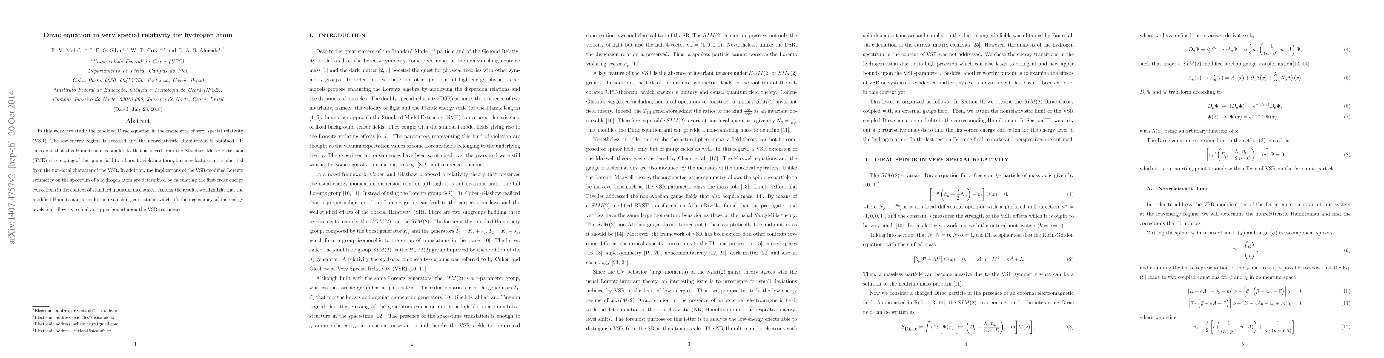 In this work, we study the modified Dirac equation in the framework of very special relativity (VSR). The low-energy regime is accessed and the nonrelativistic Hamiltonian is obtained. It turns out that this Hamiltonian is similar to that achieved from the Standard Model Extension (SME) via coupling of the spinor field to a Lorentz-violating term, but new features arise inherited from the non-local character of the VSR. In addition, the implications of the VSR-modified Lorentz symmetry on the spectrum of a hydrogen atom are determined by calculating the first-order energy corrections in the context of standard quantum mechanics. Among the results, we highlight that the modified Hamiltonian provides non-vanishing corrections which lift the degeneracy of the energy levels and allow us to find an upper bound upon the VSR-parameter.