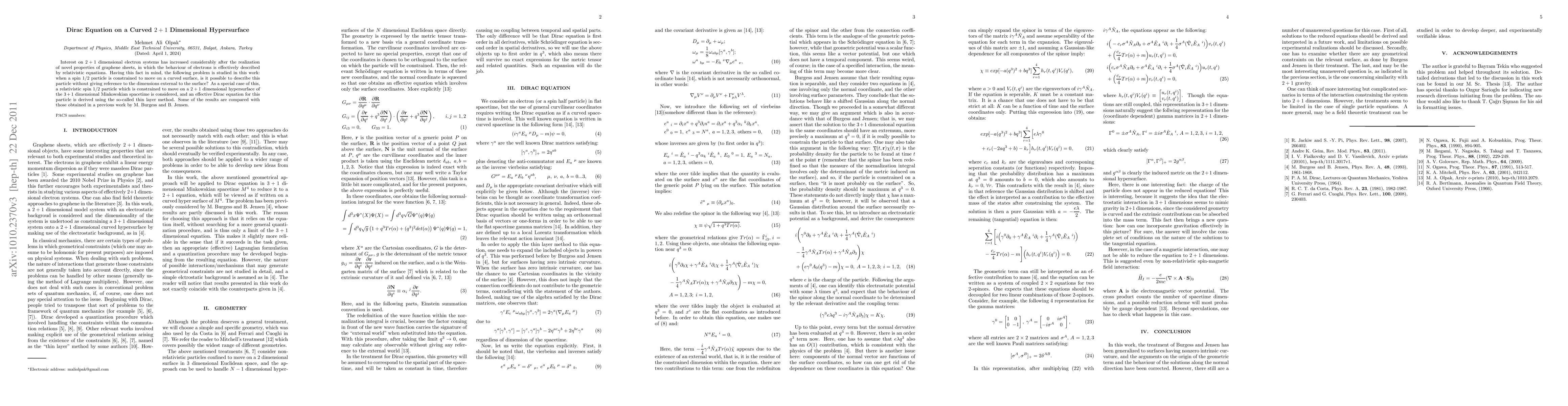 This paper investigates the Dirac equation for a spin 1/2 particle constrained to a curved 2+1 dimensional hypersurface within a 3+1 dimensional Minkowski spacetime, deriving an effective Dirac equation using the thin layer method. Comparisons with results from a previous study by M. Burgess and B. Jensen are also presented.