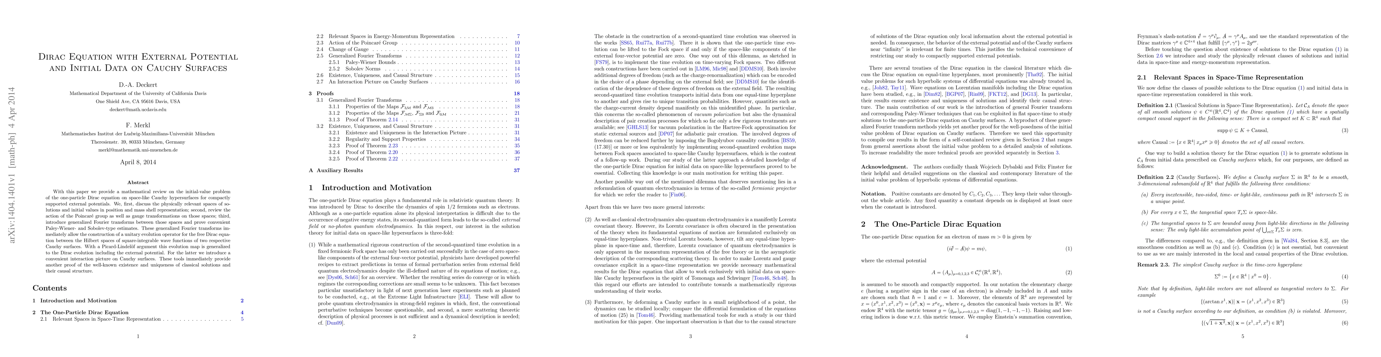 With this paper we provide a mathematical review on the initial-value problem of the one-particle Dirac equation on space-like Cauchy hypersurfaces for compactly supported external potentials. We, first, discuss the physically relevant spaces of solutions and initial values in position and mass shell representation; second, review the action of the Poincar\'e group as well as gauge transformations on those spaces; third, introduce generalized Fourier transforms between those spaces and prove convenient Paley-Wiener- and Sobolev-type estimates. These generalized Fourier transforms immediately allow the construction of a unitary evolution operator for the free Dirac equation between the Hilbert spaces of square-integrable wave functions of two respective Cauchy surfaces. With a Picard-Lindel\"of argument this evolution map is generalized to the Dirac evolution including the external potential. For the latter we introduce a convenient interaction picture on Cauchy surfaces. These tools immediately provide another proof of the well-known existence and uniqueness of classical solutions and their causal structure.