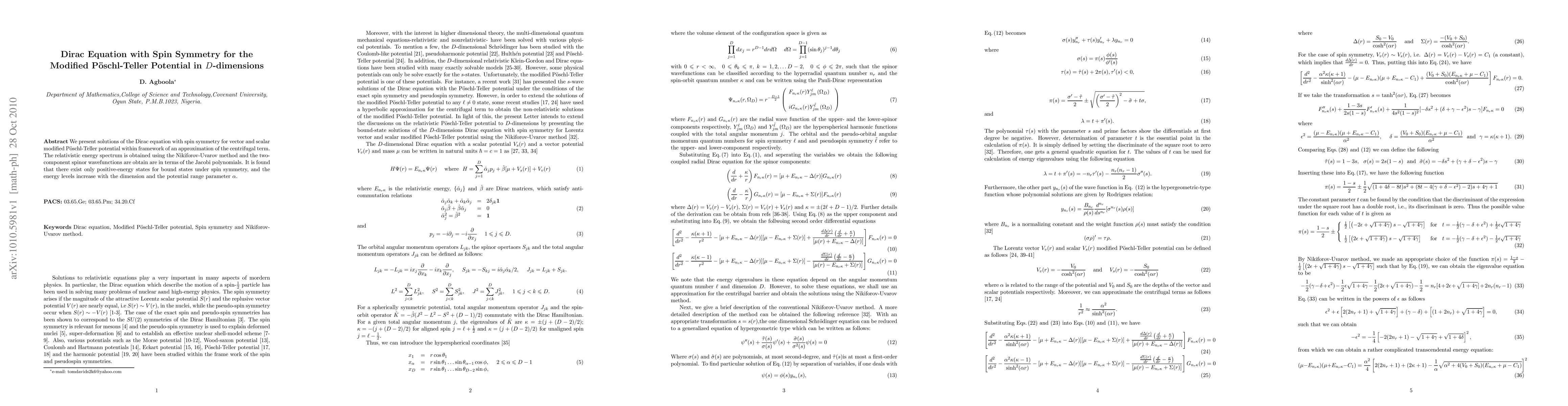 We present solutions of the Dirac equation with spin symmetry for vector and scalar modified P\"oschl-Teller potential within framework of an approximation of the centrifugal term. The relativistic energy spectrum is obtained using the Nikiforov-Uvarov method and the two-component spinor wavefunctions are obtain are in terms of the Jacobi polynomials. It is found that there exist only positive-energy states for bound states under spin symmetry, and the energy levels increase with the dimension and the potential range parameter $\alpha$.