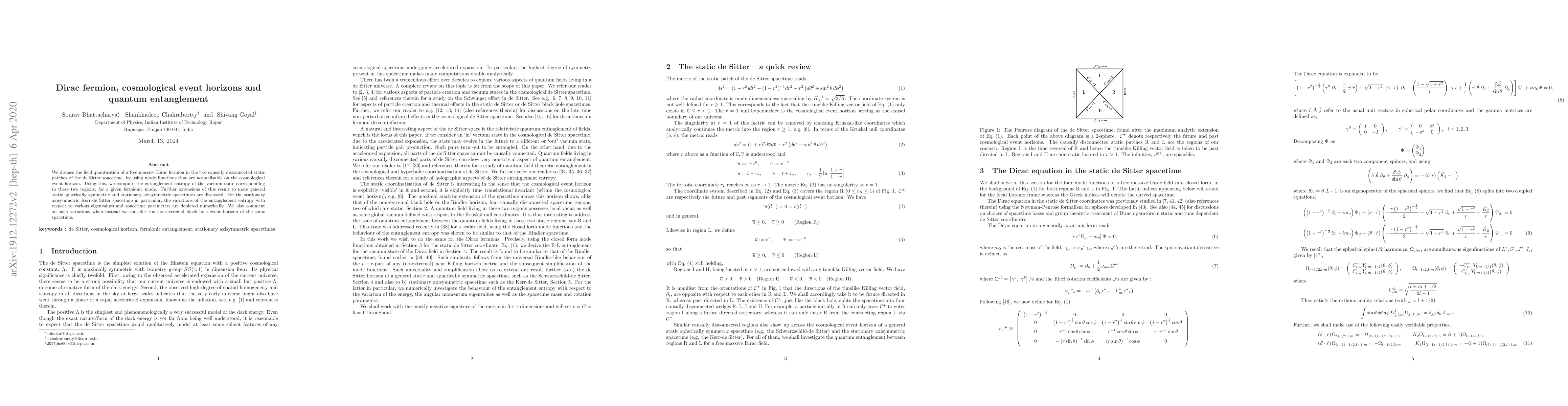We discuss the field quantisation of a free massive Dirac fermion in the two causally disconnected static patches of the de Sitter spacetime, by using mode functions that are normalisable on the cosmological event horizon. Using this, we compute the entanglement entropy of the vacuum state corresponding to these two regions, for a given fermionic mode. Further extensions of this result to more general static spherically symmetric and stationary axisymmetric spacetimes are discussed. For the stationary axisymmetric Kerr-de Sitter spacetime in particular, the variations of the entanglement entropy with respect to various eigenvalues and spacetime parameters are depicted numerically. We also comment on such variations when instead we consider the non-extremal black hole event horizon of the same spacetime.