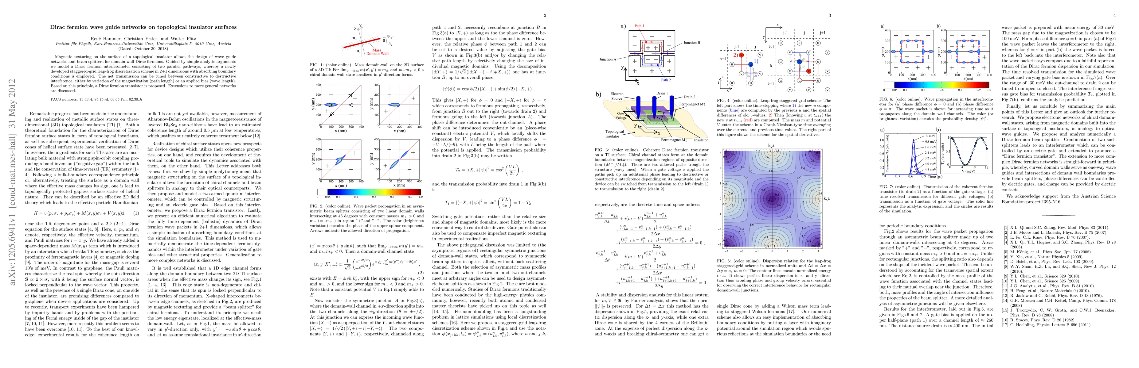 Magnetic texturing on the surface of a topological insulator allows the design of wave guide networks and beam splitters for domain-wall Dirac fermions. Guided by simple analytic arguments we model a Dirac fermion interferometer consisting of two parallel pathways, whereby a newly developed staggered-grid leap-frog discretization scheme in 2+1 dimensions with absorbing boundary conditions is employed. The net transmission can be tuned between constructive to destructive interference, either by variation of the magnetization (path length) or an applied bias (wave length). Based on this principle, a Dirac fermion transistor is proposed. Extensions to more general networks are discussed.