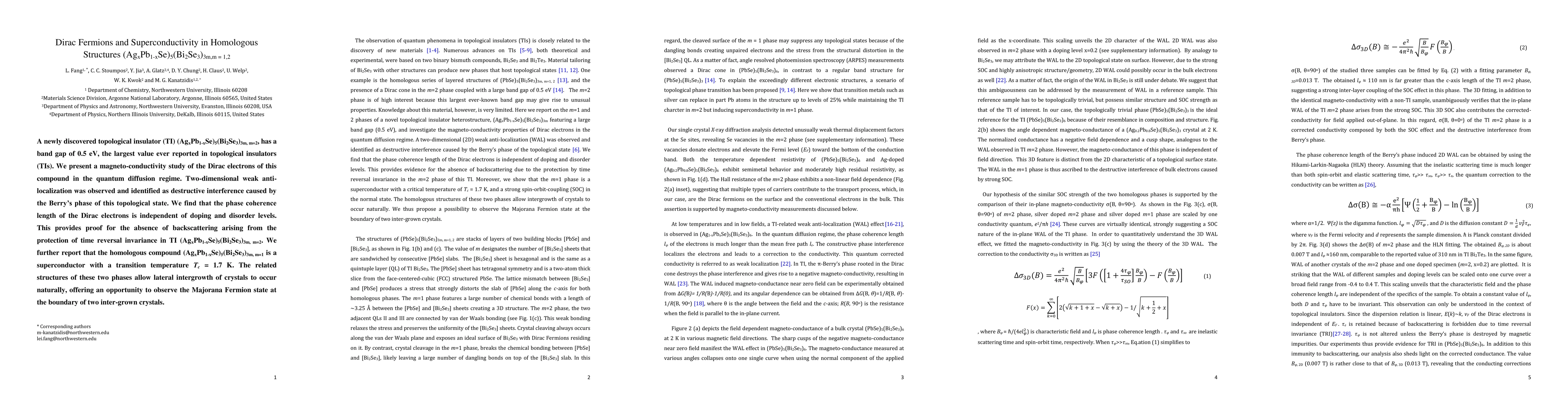 A new topological insulator with a record-breaking 0.5 eV band gap exhibits Dirac electrons showing two-dimensional weak antilocalization due to topological interference. The superconducting homologous compound demonstrates superconductivity at 1.7 K, enabling potential Majorana Fermion observations at the interface of intergrown crystals.