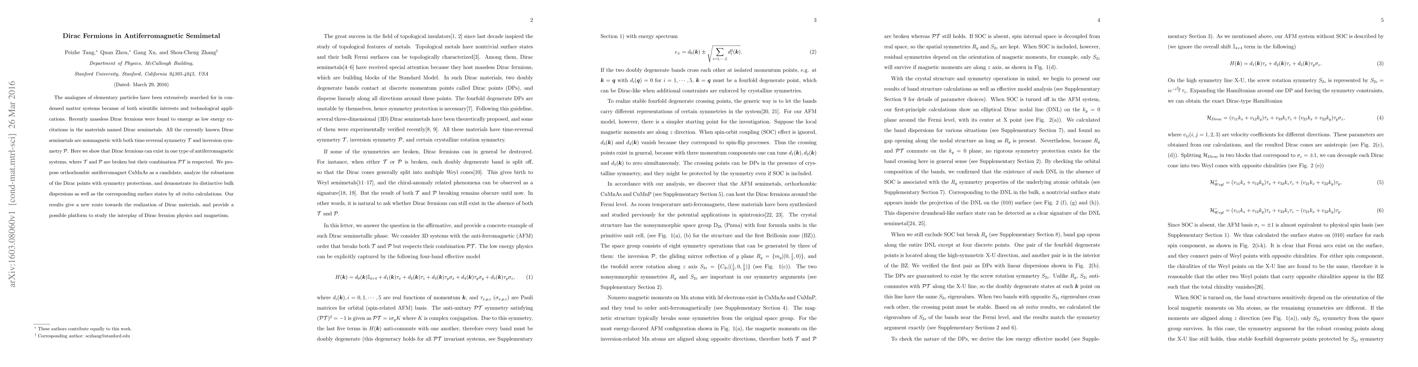 The analogues of elementary particles have been extensively searched for in condensed matter systems because of both scientific interests and technological applications. Recently massless Dirac fermions were found to emerge as low energy excitations in the materials named Dirac semimetals. All the currently known Dirac semimetals are nonmagnetic with both time-reversal symmetry $\mathcal{T}$ and inversion symmetry $\mathcal{P}$. Here we show that Dirac fermions can exist in one type of antiferromagnetic systems, where $\mathcal{T}$ and $\mathcal{P}$ are broken but their combination $\mathcal{PT}$ is respected. We propose orthorhombic antiferromagnet CuMnAs as a candidate, analyze the robustness of the Dirac points with symmetry protections, and demonstrate its distinctive bulk dispersions as well as the corresponding surface states by \emph{ab initio} calculations. Our results give a new route towards the realization of Dirac materials, and provide a possible platform to study the interplay of Dirac fermion physics and magnetism.