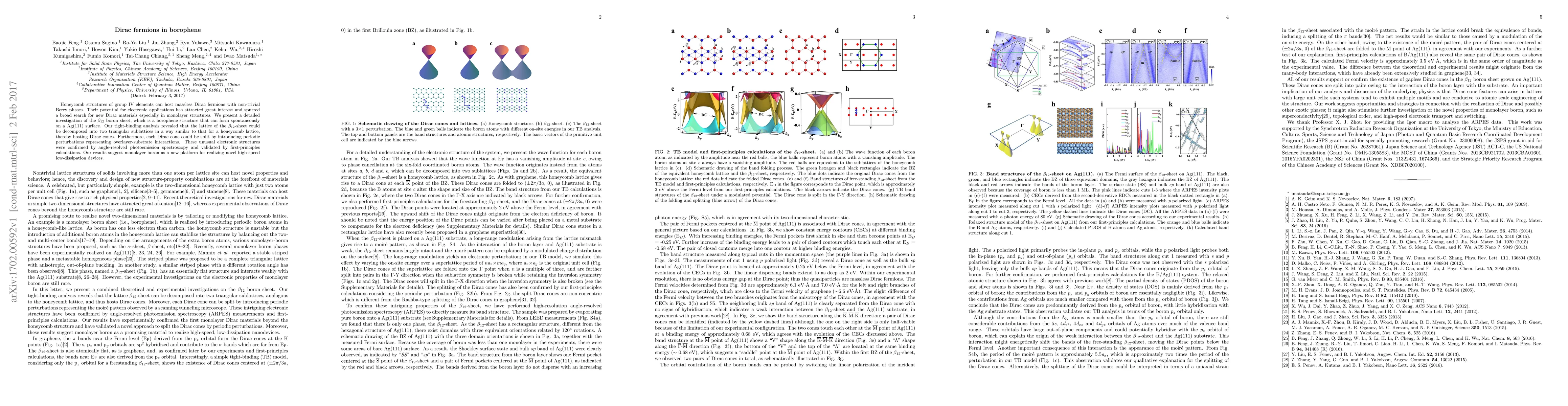 Honeycomb structures of group IV elements can host massless Dirac fermions with non-trivial Berry phases. Their potential for electronic applications has attracted great interest and spurred a broad search for new Dirac materials especially in monolayer structures. We present a detailed investigation of the \beta 12 boron sheet, which is a borophene structure that can form spontaneously on a Ag(111) surface. Our tight-binding analysis revealed that the lattice of the \beta 12-sheet could be decomposed into two triangular sublattices in a way similar to that for a honeycomb lattice, thereby hosting Dirac cones. Furthermore, each Dirac cone could be split by introducing periodic perturbations representing overlayer-substrate interactions. These unusual electronic structures were confirmed by angle-resolved photoemission spectroscopy and validated by first-principles calculations. Our results suggest monolayer boron as a new platform for realizing novel high-speed low-dissipation devices.