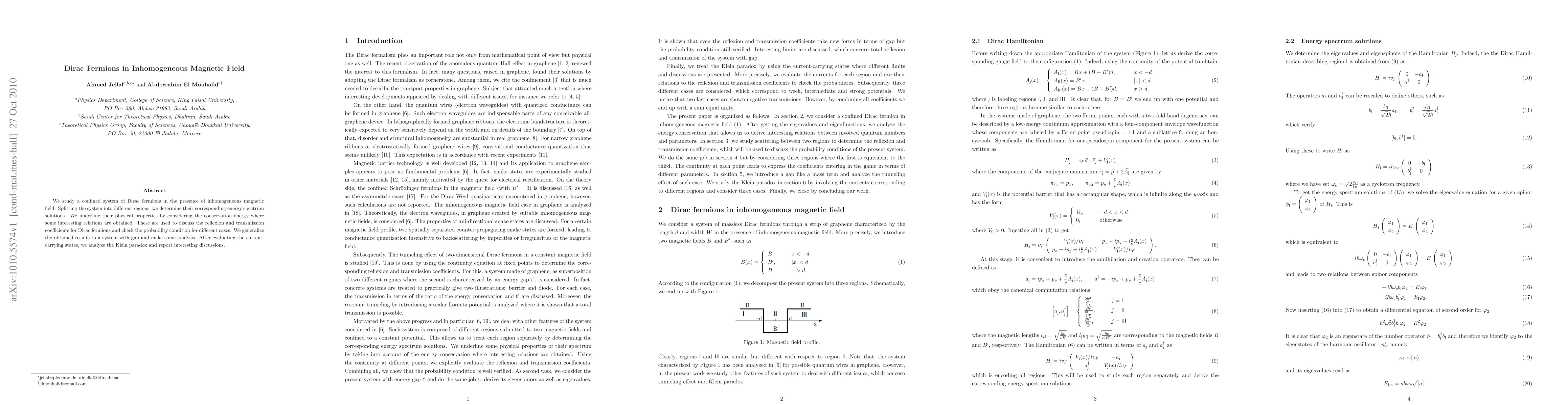 The study analyzes Dirac fermions in an inhomogeneous magnetic field, splitting the system into regions and determining energy spectrum solutions. It examines reflection and transmission coefficients, considering energy conservation and generalizing results to a system with a gap.