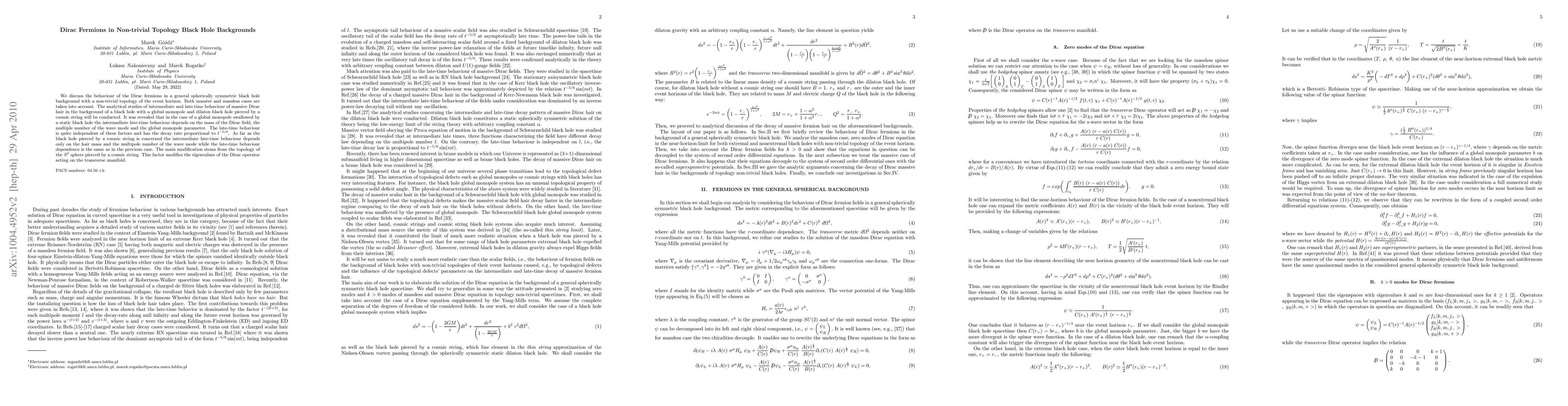 We discuss the behaviour of the Dirac fermions in a general spherically symmetric black hole background with a non-trivial topology of the event horizon. Both massive and massless cases are taken into account. The analytical studies of intermediate and late-time behaviour of massive Dirac hair in the background of a black hole with a global monopole and dilaton black hole pierced by a cosmic string will be conducted. It was revealed that in the case of a global monopole swallowed by a static black hole the intermediate late-time behaviour depends on the mass of the Dirac field, the multiple number of the wave mode and the global monopole parameter. The late-time behaviour is quite independent of these factors and has the decay rate proportional to $t^{-5/6}$. As far as the black hole pierced by a cosmic string is concerned the intermediate late-time behaviour depends only on the hair mass and the multipole number of the wave mode while the late-time behaviour dependence is the same as in the previous case. The main modification stems from the topology of the $S^2$ sphere pierced by a cosmic string. This factor modifies the eigenvalues of the Dirac operator acting on the transverse manifold.