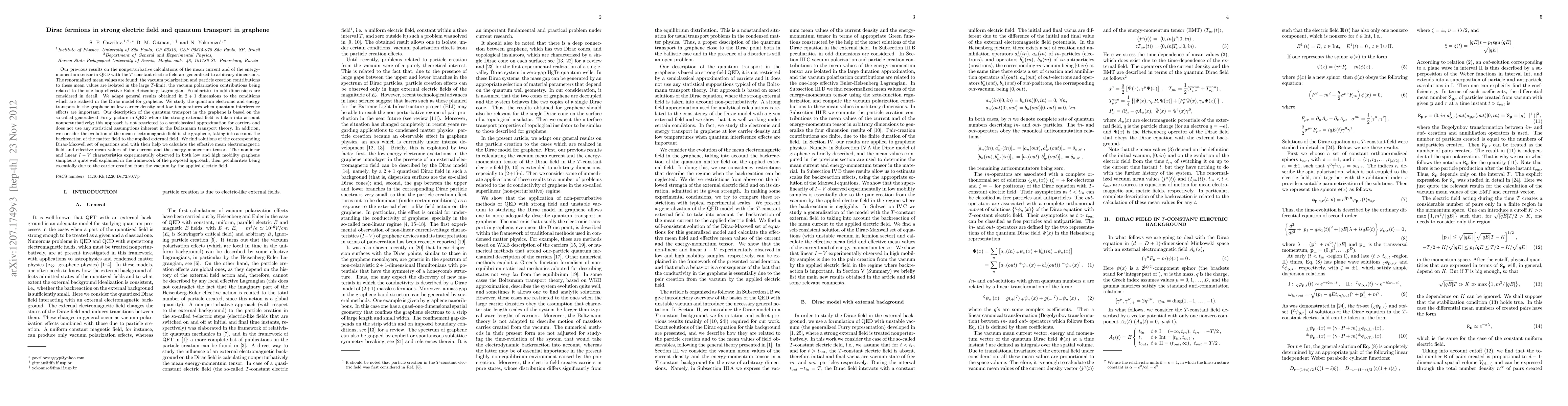 This paper generalizes nonperturbative QED calculations for mean current and energy-momentum tensor in strong electric fields to arbitrary dimensions, adapting these results to graphene's Dirac fermions. It provides a comprehensive description of quantum transport in graphene, considering quantum interference effects and the backreaction of matter fields on the electromagnetic field, explaining observed nonlinear and linear I-V characteristics.