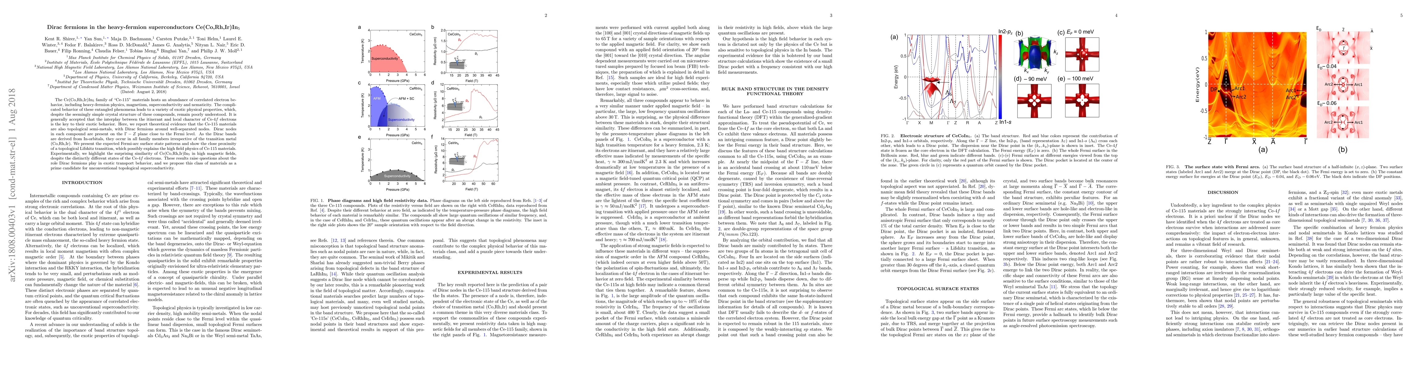 The Ce(Co,Rh,Ir)In$_5$ family of ``Ce-115'' materials hosts an abundance of correlated electron behavior, including heavy-fermion physics, magnetism, superconductivity and nematicity. The complicated behavior of these entangled phenomena leads to a variety of exotic physical properties, which, despite the seemingly simple crystal structure of these compounds, remain poorly understood. It is generally accepted that the interplay between the itinerant and local character of Ce-$4f$ electrons is the key to their exotic behavior. Here, we report theoretical evidence that the Ce-115 materials are also topological semi-metals, with Dirac fermions around well-separated nodes. Dirac nodes in each compound are present on the $\Gamma-Z$ plane close to the Fermi level. As the Dirac bands are derived from In-orbitals, they occur in all family members irrespective of the transition metal (Co,Rh,Ir). We present the expected Fermi-arc surface state patterns and show the close proximity of a topological Lifshitz transition, which possibly explains the high field physics of Ce-115 materials. Experimentally, we highlight the surprising similarity of Ce(Co,Rh,Ir)In$_5$ in high magnetic fields, despite the distinctly different states of the Ce-$4f$ electrons. These results raise questions about the role Dirac fermions play in exotic transport behavior, and we propose this class of materials as a prime candidate for unconventional topological superconductivity.