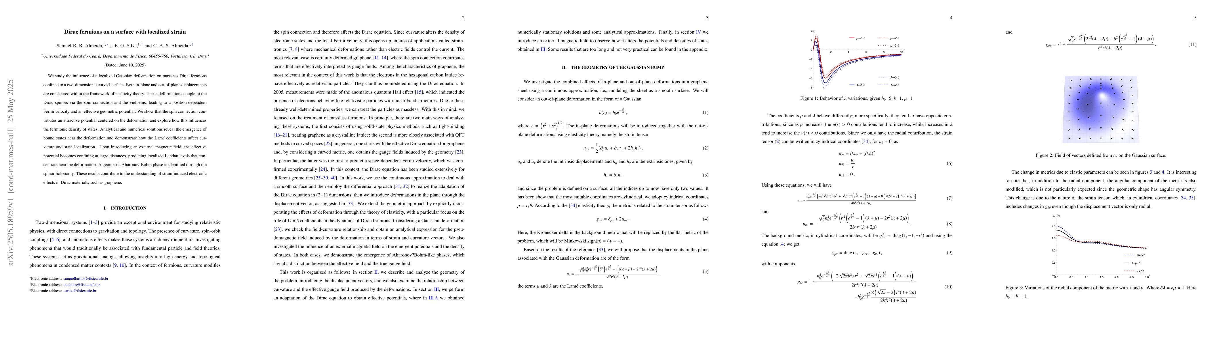 The paper presents a comprehensive analysis of how localized strain affects Dirac fermions on curved surfaces, incorporating spin connection, vielbeins, and elasticity theory to derive position-dependent Fermi velocity and geometric potential.