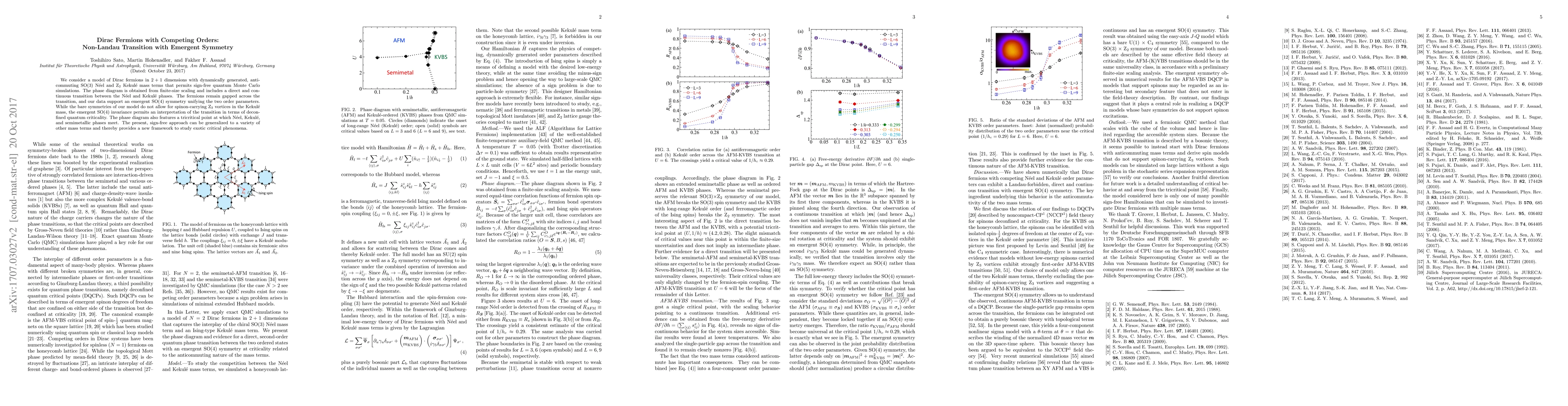 We consider a model of Dirac fermions in $2+1$ dimensions with dynamically generated, anticommuting SO(3) N\'eel and Z$_2$ Kekul\'e mass terms that permits sign-free quantum Monte Carlo simulations. The phase diagram is obtained from finite-size scaling and includes a direct and continuous transition between the N\'eel and Kekul\'e phases. The fermions remain gapped across the transition, and our data support an emergent SO(4) symmetry unifying the two order parameters. While the bare symmetries of our model do not allow for spinon-carrying Z$_3$ vortices in the Kekul\'e mass, the emergent SO(4) invariance permits an interpretation of the transition in terms of deconfined quantum criticality. The phase diagram also features a tricritical point at which N\'eel, Kekul\'e, and semimetallic phases meet. The present, sign-free approach can be generalized to a variety of other mass terms and thereby provides a new framework to study exotic critical phenomena.