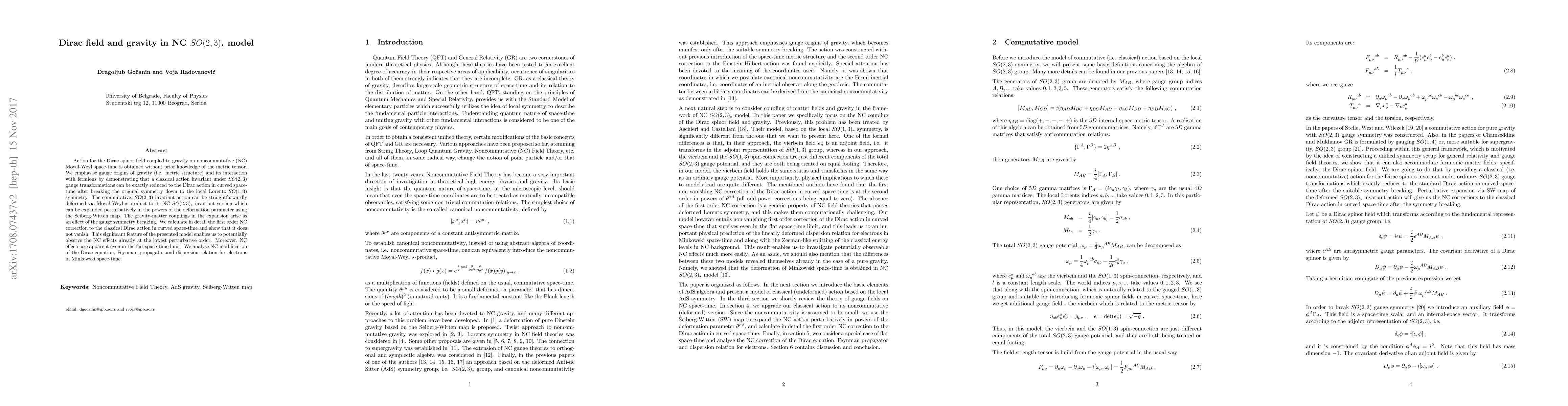 This paper develops a noncommutative $SO(2,3)_\star$ model where the Dirac field interacts with gravity on Moyal-Weyl space-time. It demonstrates gauge origins of gravity and calculates the first-order noncommutative correction to the classical Dirac action, showing that noncommutative effects are observable even at the lowest perturbative order.