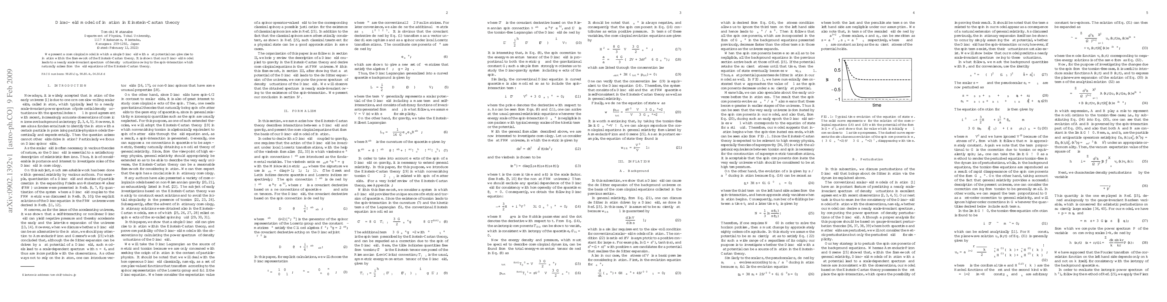 This paper proposes a cosmological model where inflation is driven by a single Dirac field with a flat potential within the Einstein-Cartan theory, resulting in a nearly scale-invariant spectrum of density fluctuations due to the inherent spin-interactions from the field equations.