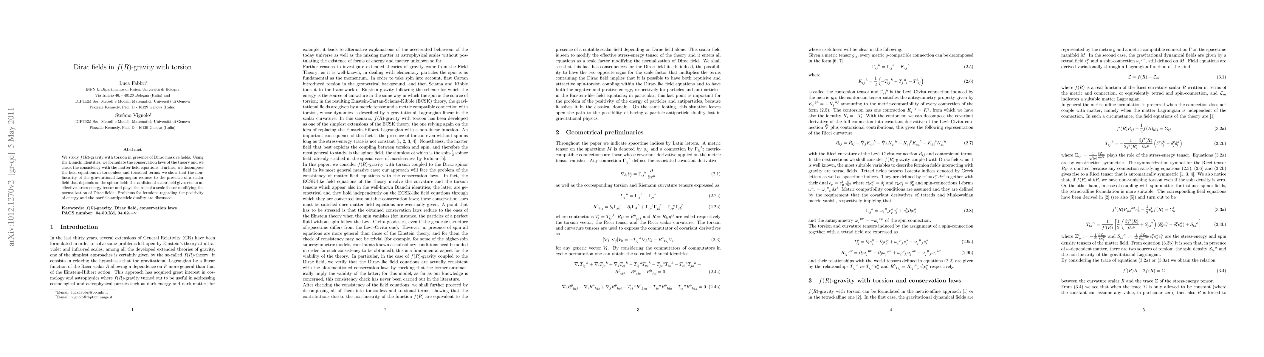 This paper investigates f(R)-gravity with torsion in the presence of Dirac massive fields, formulating conservation laws and examining consistency with the matter field equations. It reveals that the non-linearity of the gravitational Lagrangian leads to a scalar field dependent on the spinor field, affecting Dirac field normalization and raising issues regarding energy positivity and particle-antiparticle duality.