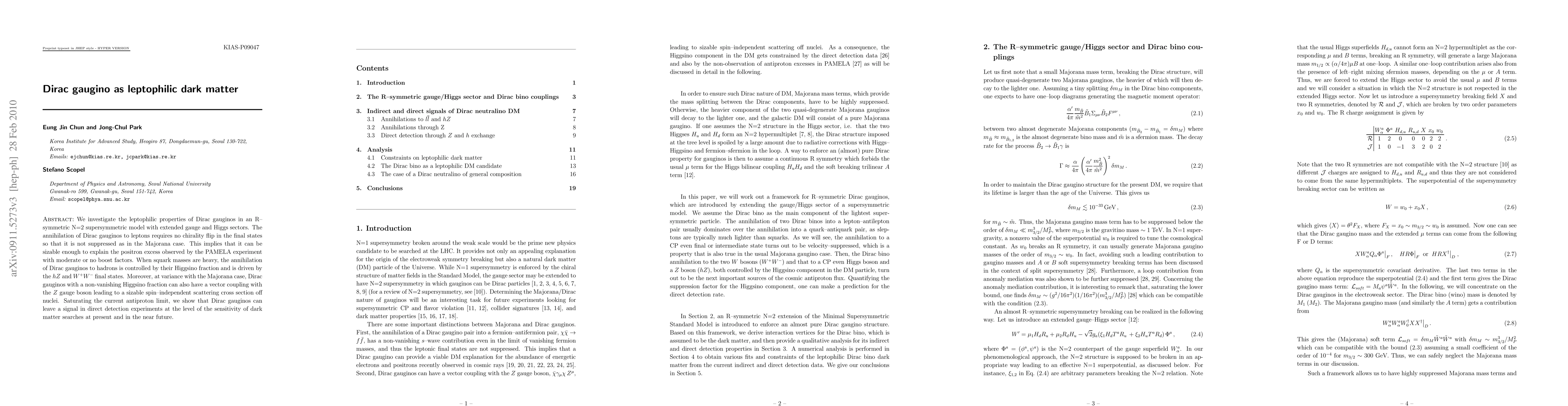We investigate the leptophilic properties of Dirac gauginos in an R--symmetric N=2 supersymmetric model with extended gauge and Higgs sectors. The annihilation of Dirac gauginos to leptons requires no chirality flip in the final states so that it is not suppressed as in the Majorana case. This implies that it can be sizable enough to explain the positron excess observed by the PAMELA experiment with moderate or no boost factors. When squark masses are heavy, the annihilation of Dirac gauginos to hadrons is controlled by their Higgsino fraction and is driven by the $hZ$ and $W^+W^-$ final states. Moreover, at variance with the Majorana case, Dirac gauginos with a non-vanishing higgsino fraction can also have a vector coupling with the $Z$ gauge boson leading to a sizable spin--independent scattering cross section off nuclei. Saturating the current antiproton limit, we show that Dirac gauginos can leave a signal in direct detection experiments at the level of the sensitivity of dark matter searches at present and in the near future.
