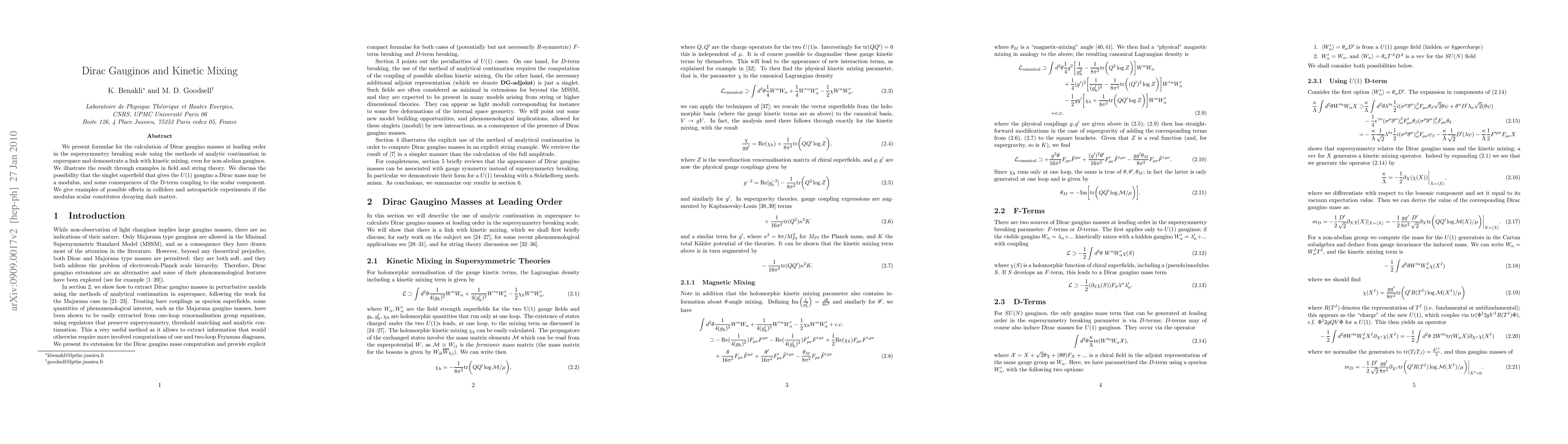 This paper derives leading-order formulae for Dirac gaugino masses using analytic continuation in superspace and links these to kinetic mixing, even for non-abelian gauginos. It explores the implications of a modulus superfield giving Dirac mass to U(1) gauginos and discusses potential collider and astroparticle effects if this modulus constitutes dark matter.