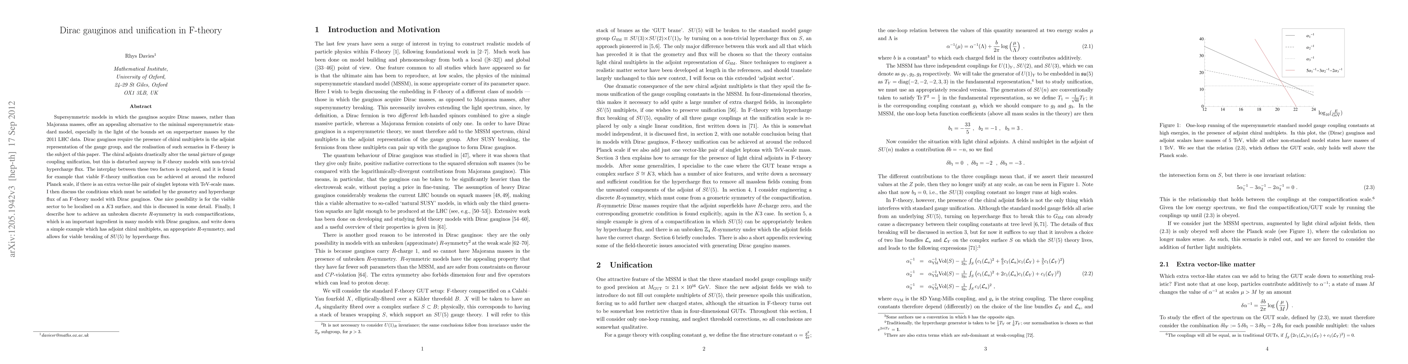This paper explores the realization of supersymmetric models with Dirac gauginos in F-theory, showing how chiral adjoints can lead to viable unification at the Planck scale despite altering gauge coupling unification. It discusses the necessary geometry and flux conditions for such models, including the localization of the visible sector on a K3 surface and the maintenance of an unbroken discrete R-symmetry.