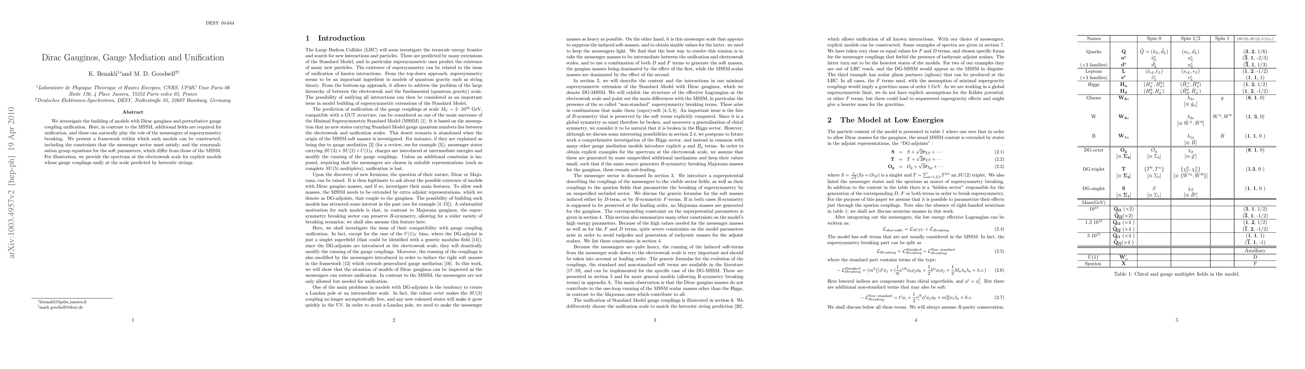 This paper explores the construction of models with Dirac gauginos and perturbative gauge coupling unification, requiring additional fields that serve as messengers of supersymmetry breaking. It presents a framework for such models, detailing the constraints on the messenger sector and the distinct renormalization group equations for soft parameters compared to the MSSM.