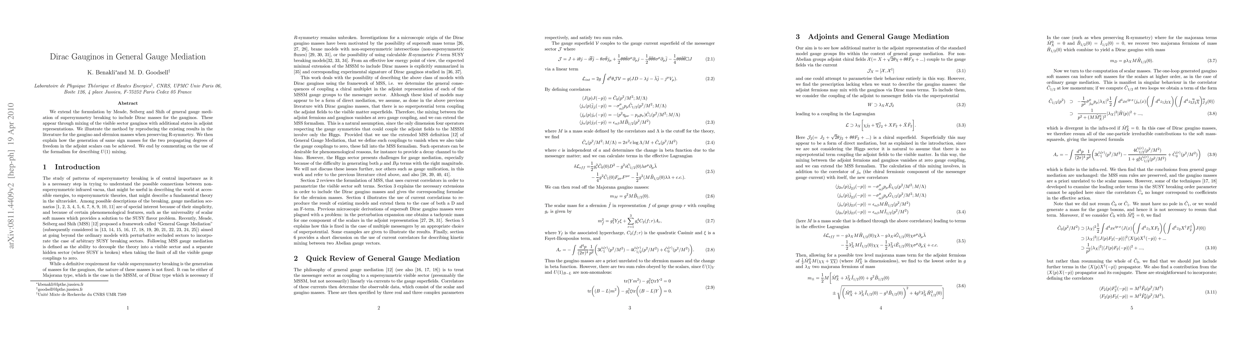 This paper extends the theory of general gauge mediation to include Dirac gauginos, achieved by mixing visible sector gauginos with additional adjoint states. It demonstrates the method's ability to reproduce existing results while explaining how same-sign masses for adjoint scalars can be generated, and discusses its application to U(1) mixing.