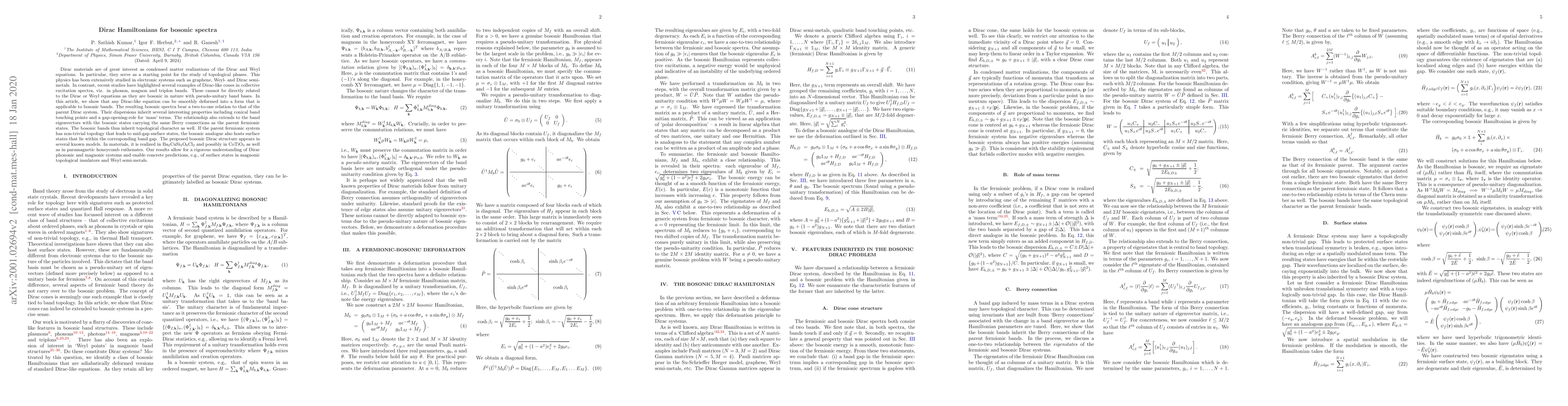 Dirac materials are of great interest as condensed matter realizations of the Dirac and Weyl equations. In particular, they serve as a starting point for the study of topological phases. This physics has been extensively studied in electronic systems such as graphene, Weyl- and Dirac semi-metals. In contrast, recent studies have highlighted several examples of Dirac-like cones in collective excitation spectra, viz. in phonon, magnon and triplon bands. These cannot be directly related to the Dirac or Weyl equations as they are bosonic in nature with pseudo-unitary band bases. In this article, we show that any Dirac-like equation can be smoothly deformed into a form that is applicable to bosonic bands. The resulting bosonic spectra bear a two-to-one relation to that of the parent Dirac system. Their dispersions inherit several interesting properties including conical band touching points and a gap-opening-role for `mass' terms. The relationship also extends to the band eigenvectors with the bosonic states carrying the same Berry connections as the parent fermionic states. The bosonic bands thus inherit topological character as well. If the parent fermionic system has non-trivial topology that leads to mid-gap surface states, the bosonic analogue also hosts surface states that lie within the corresponding band gap. The proposed bosonic Dirac structure appears in several known models. In materials, it is realized in Ba$_2$CuSi$_2$O$_6$Cl$_2$ and possibly in CoTiO$_3$ as well as in paramagnetic honeycomb ruthenates. Our results allow for a rigorous understanding of Dirac phononic and magnonic systems and enable concrete predictions, e.g., of surface states in magnonic topological insulators and Weyl semi-metals.