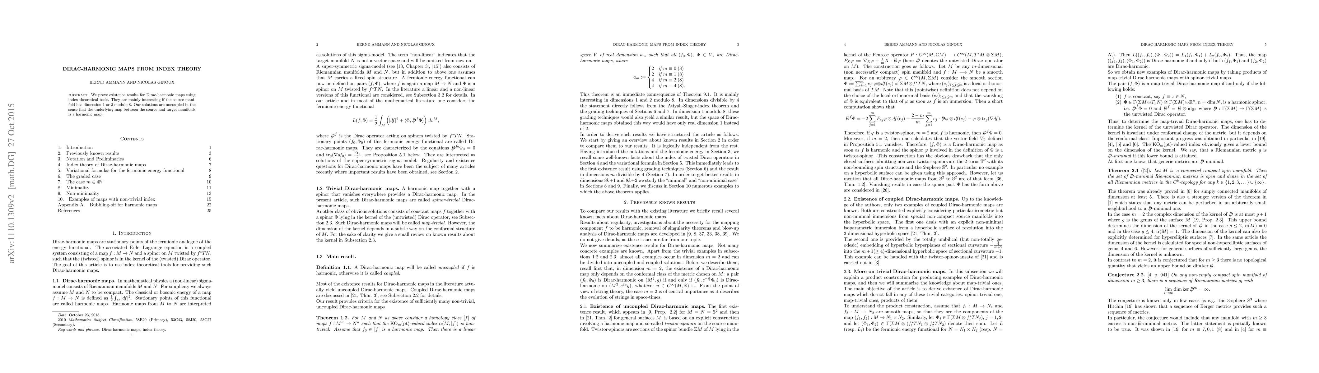 Summary: This paper establishes the existence of Dirac-harmonic maps through index theory, particularly relevant for source manifolds of dimensions 1 or 2 modulo 8, and demonstrates that these maps are uncoupled, meaning they are harmonic maps.