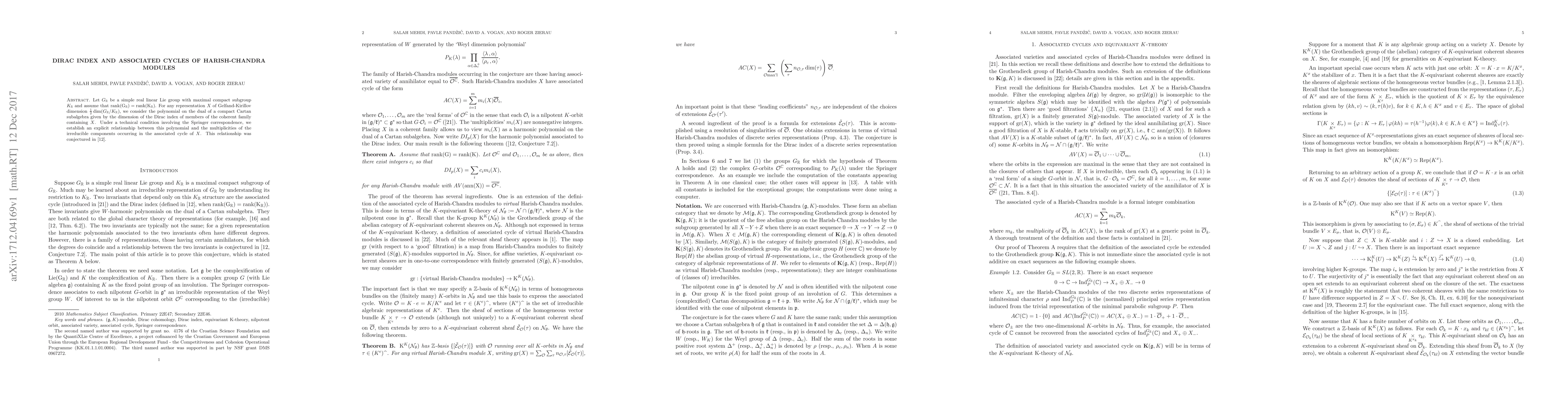 This paper establishes a relationship between the Dirac index polynomial of Harish-Chandra modules and the multiplicities of irreducible components in their associated cycles, confirming a previous conjecture. It focuses on simple real linear Lie groups under specific rank conditions.