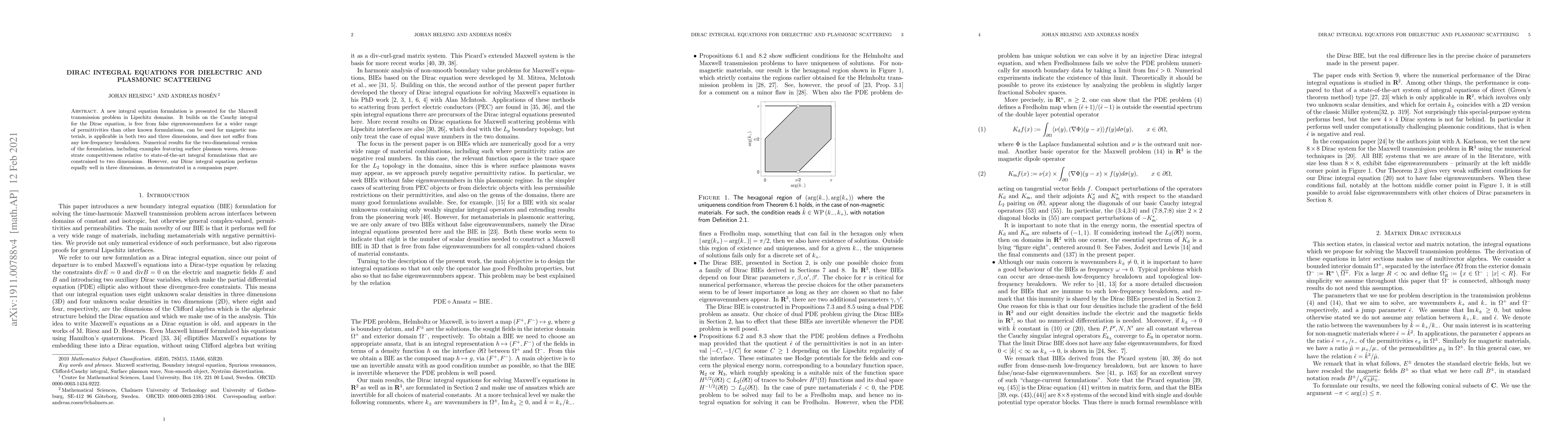 This paper introduces a novel Dirac integral equation for solving the Maxwell transmission problem in dielectric and plasmonic scattering, offering advantages such as wider applicability, avoidance of false eigenwavenumbers, and performance in both 2D and 3D without low-frequency breakdown. Numerical results show its competitiveness against existing 2D formulations.
