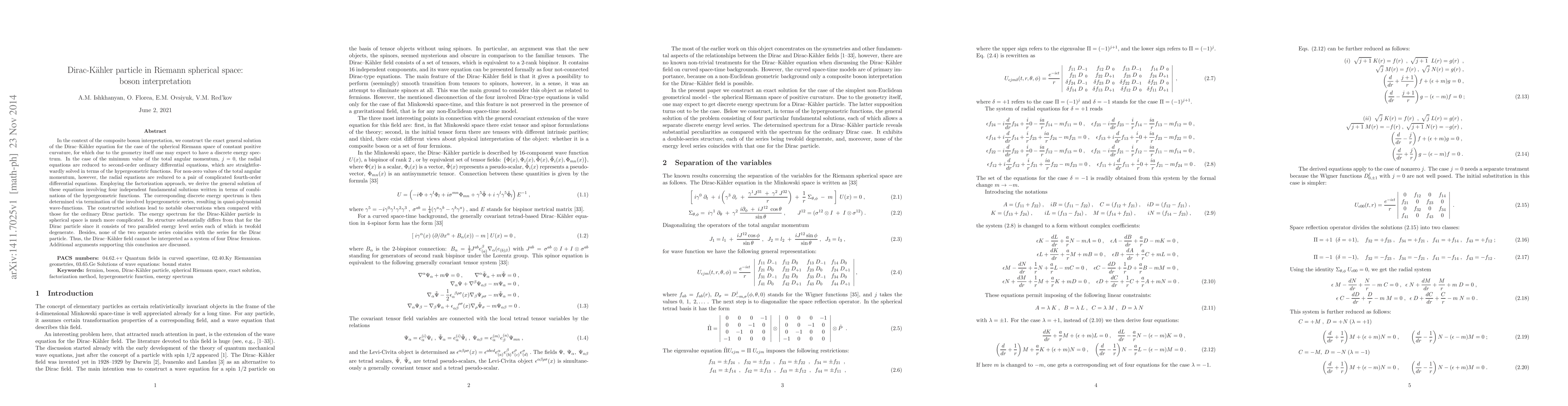 In the context of the composite boson interpretation, we construct the exact general solution of the Dirac--K\"ahler equation for the case of the spherical Riemann space of constant positive curvature, for which due to the geometry itself one may expect to have a discrete energy spectrum. In the case of the minimal value of the total angular momentum, $j=0$, the radial equations are reduced to second-order ordinary differential equations, which are straightforwardly solved in terms of the hypergeometric functions. For non-zero values of the total angular momentum, however, the radial equations are reduced to a pair of complicated fourth-order differential equations. Employing the factorization approach, we derive the general solution of these equations involving four independent fundamental solutions written in terms of combinations of the hypergeometric functions. The corresponding discrete energy spectrum is then determined via termination of the involved hypergeometric series, resulting in quasi-polynomial wave-functions. The constructed solutions lead to notable observations when compared with those for the ordinary Dirac particle. The energy spectrum for the Dirac-K\"ahler particle in spherical space is much more complicated. Its structure substantially differs from that for the Dirac particle since it consists of two paralleled energy level series each of which is twofold degenerate. Besides, none of the two separate series coincides with the series for the Dirac particle. Thus, the Dirac--K\"ahler field cannot be interpreted as a system of four Dirac fermions. Additional arguments supporting this conclusion are discussed.