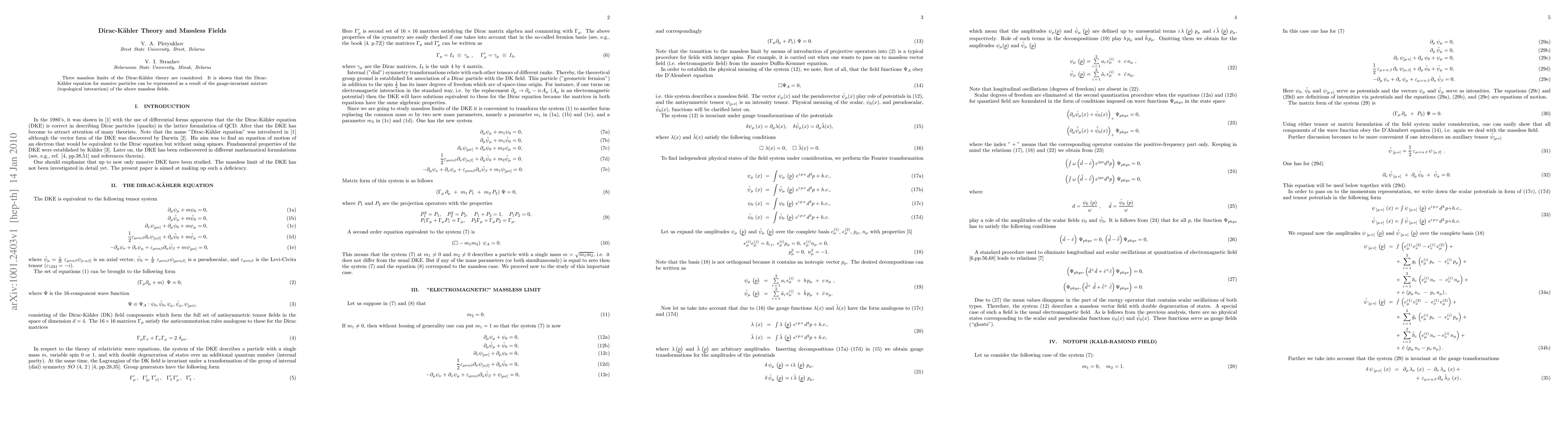 This paper explores three massless limits of Dirac-Kahler theory, showing that massive particles can be represented as a gauge-invariant mixture of these massless fields.