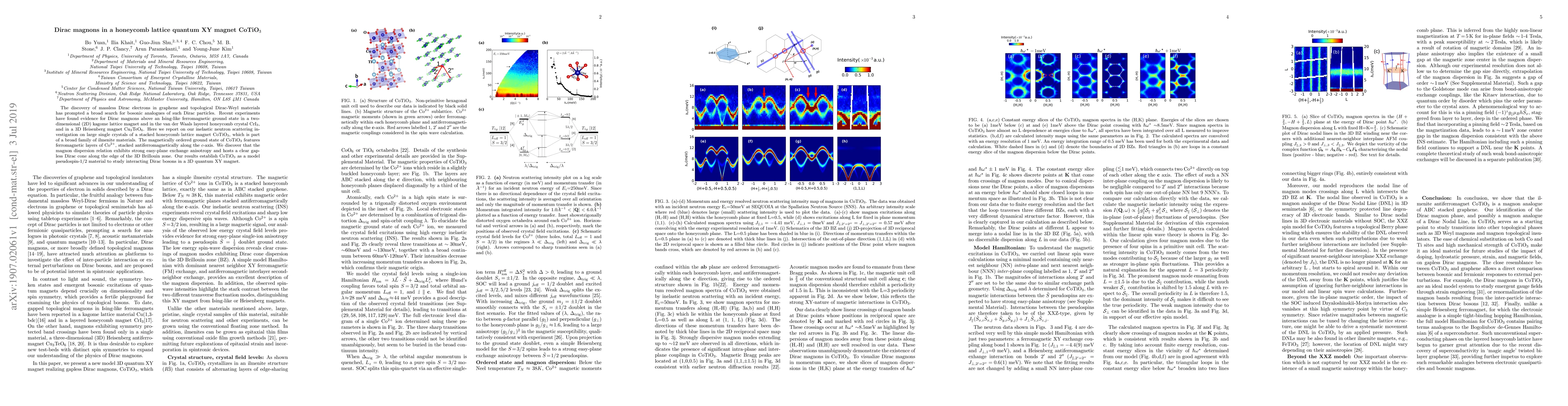 This paper reports on the discovery of Dirac magnons in CoTiO$_3$, a honeycomb lattice quantum XY magnet, revealing a gapless Dirac cone in its magnon dispersion through neutron scattering. CoTiO$_3$ is identified as a model material for studying interacting Dirac bosons in a 3D quantum XY magnet.