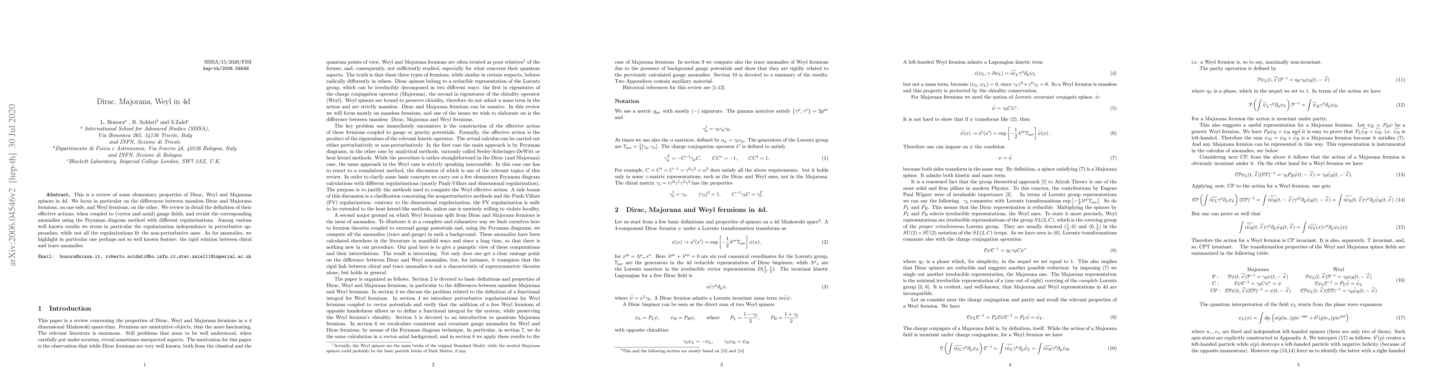 This paper reviews the properties of Dirac, Weyl, and Majorana spinors in 4 dimensions, emphasizing the distinctions between massless Dirac and Majorana fermions and Weyl fermions. It details their effective actions when coupled to gauge fields and discusses the associated anomalies, highlighting the regularization independence in perturbative approaches and the rigid relation between chiral and trace anomalies.