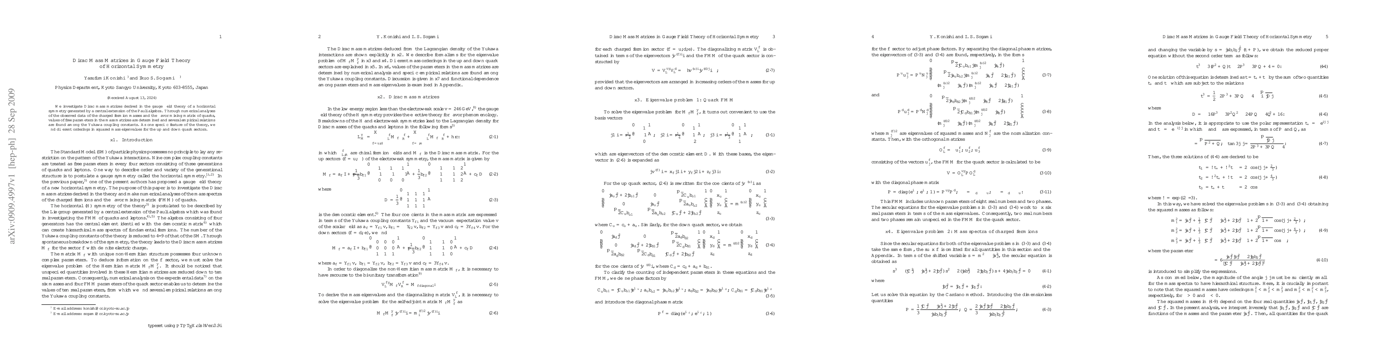 This paper explores Dirac mass matrices in gauge field theory with a horizontal symmetry, determining free parameters through numerical analysis of fermion masses and quark mixing. It reveals distinct orderings in squared mass eigenvalues for up and down quarks and identifies empirical relations among Yukawa coupling constants.