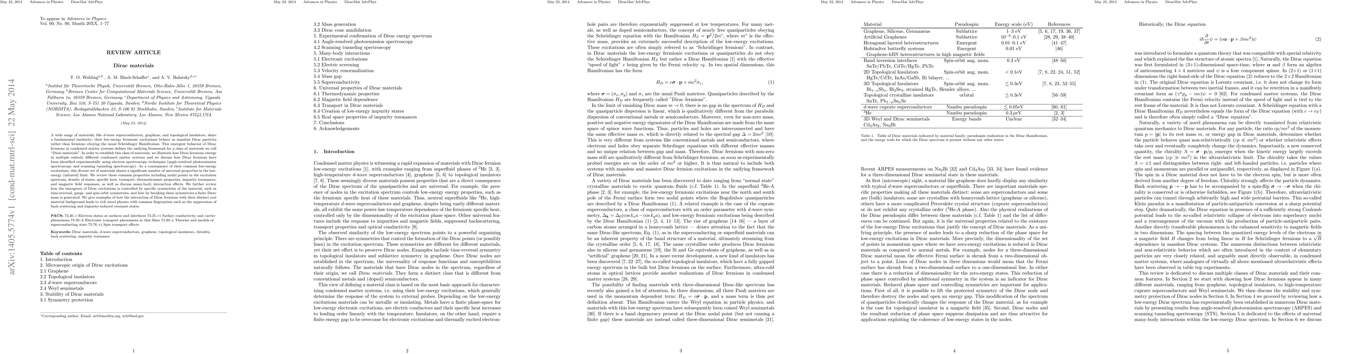 This paper explores "Dirac materials," a class of condensed matter systems where low-energy excitations behave as massless Dirac particles, unifying materials like d-wave superconductors, graphene, and topological insulators. It reviews experimental identification methods and common properties of these materials, emphasizing the role of symmetries in generating Dirac excitations and the resulting novel physics.
