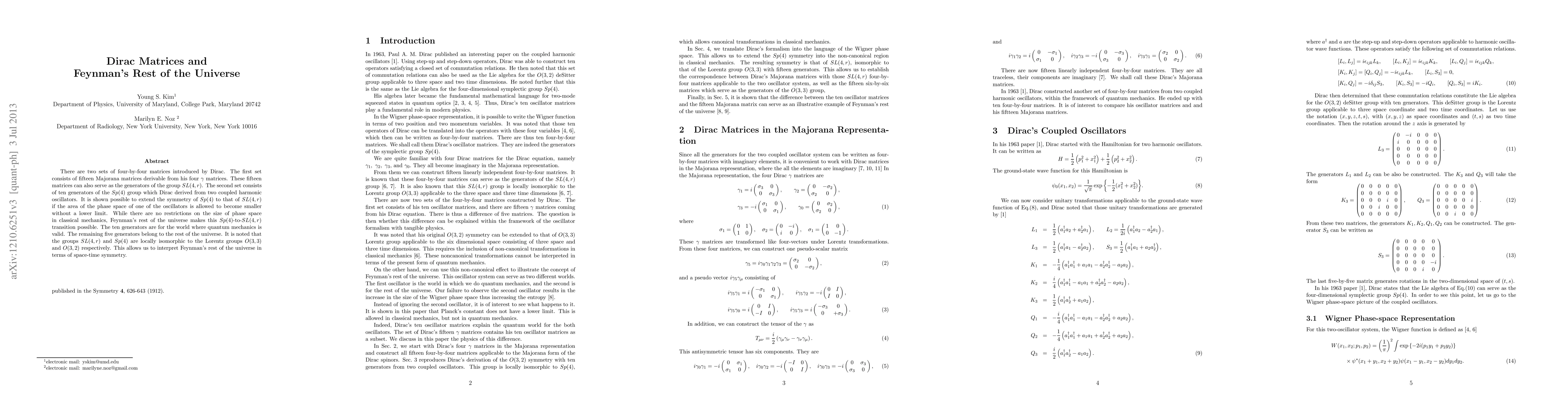 There are two sets of four-by-four matrices introduced by Dirac. The first set consists of fifteen Majorana matrices derivable from his four $\gamma$ matrices. These fifteen matrices can also serve as the generators of the group $SL(4,r)$. The second set consists of ten generators of the $Sp(4)$ group which Dirac derived from two coupled harmonic oscillators. It is shown possible to extend the symmetry of $Sp(4)$ to that of $SL(4,r)$ if the area of the phase space of one of the oscillators is allowed to become smaller without a lower limit. While there are no restrictions on the size of phase space in classical mechanics, Feynman's rest of the universe makes this $Sp(4)$-to-$SL(4,r)$ transition possible. The ten generators are for the world where quantum mechanics is valid. The remaining five generators belong to the rest of the universe. It is noted that the groups $SL(4,r)$ and $Sp(4)$ are locally isomorphic to the Lorentz groups O(3,3) and O(3,2) respectively. This allows us to interpret Feynman's rest of the universe in terms of space-time symmetry.
