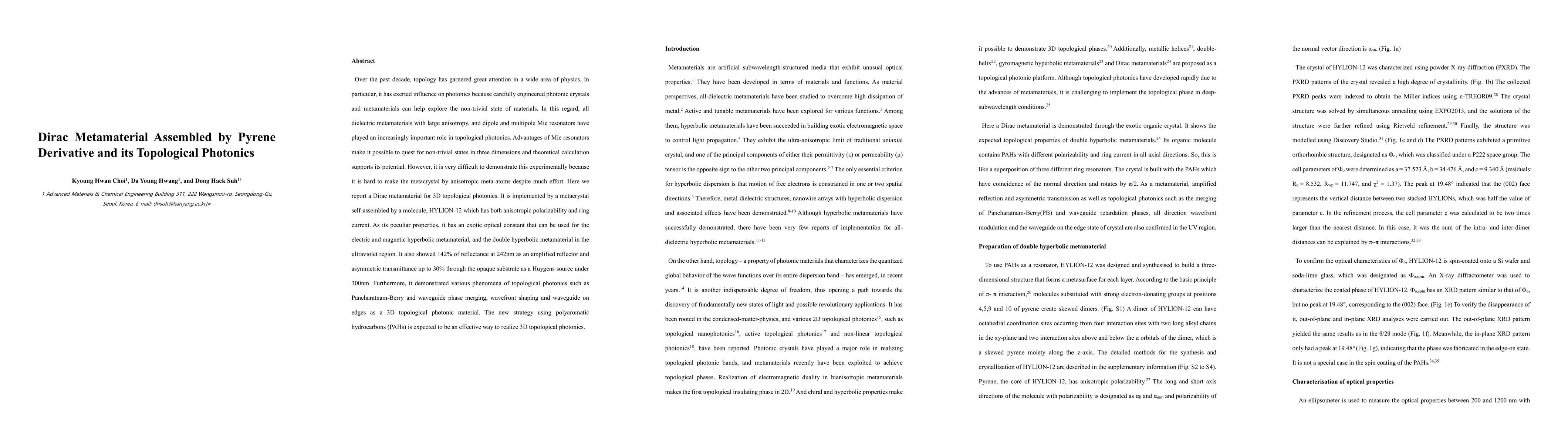 This paper reports the development of a Dirac metamaterial assembled from a pyrene derivative molecule, HYLION-12, for 3D topological photonics. The metacrystal exhibits unique optical properties, including high reflectance and asymmetric transmittance, and demonstrates various topological photonic phenomena.