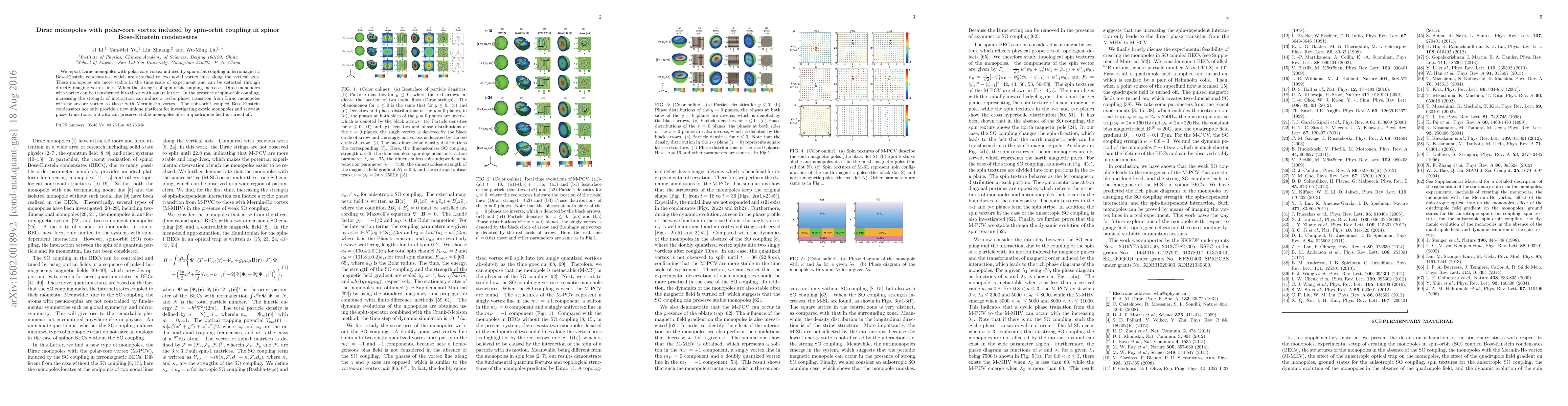 This paper reports the formation of Dirac monopoles with polar-core vortices in spinor Bose-Einstein condensates due to spin-orbit coupling, which are stable and detectable via imaging. Increasing spin-orbit coupling strength can transform these monopoles into a square lattice and induce cyclic phase transitions.