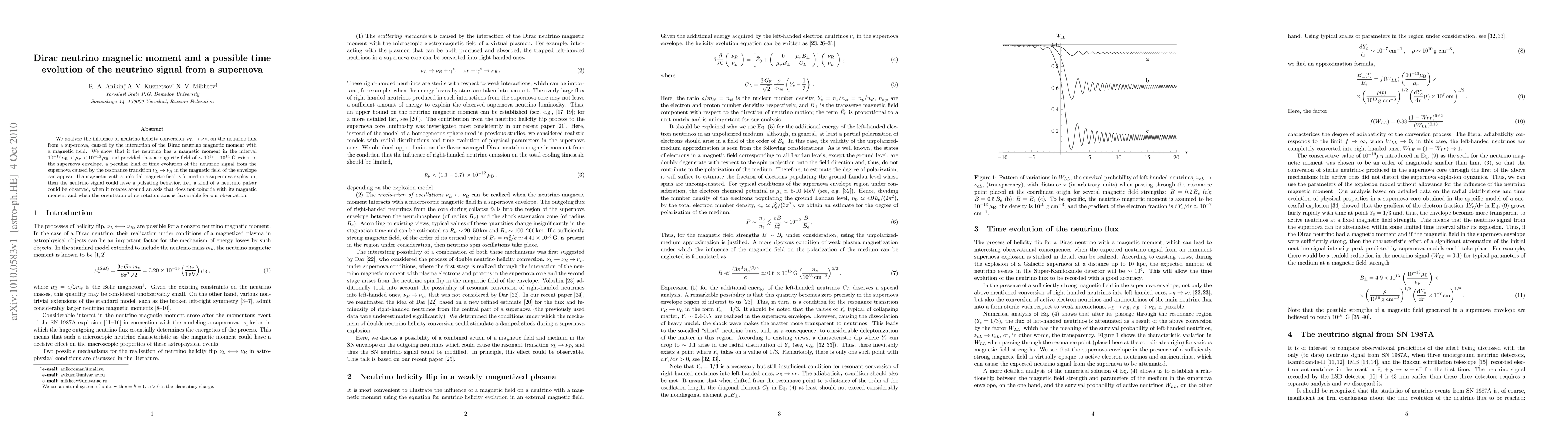 This paper investigates how neutrino helicity conversion ($\nu_L \to \nu_R$) affects the neutrino flux from a supernova, driven by the interaction of the Dirac neutrino magnetic moment with magnetic fields. It suggests that within a specific magnetic moment range and magnetic field strength, a time-evolving neutrino signal, potentially exhibiting pulsating behavior akin to a neutrino pulsar, could be observed.