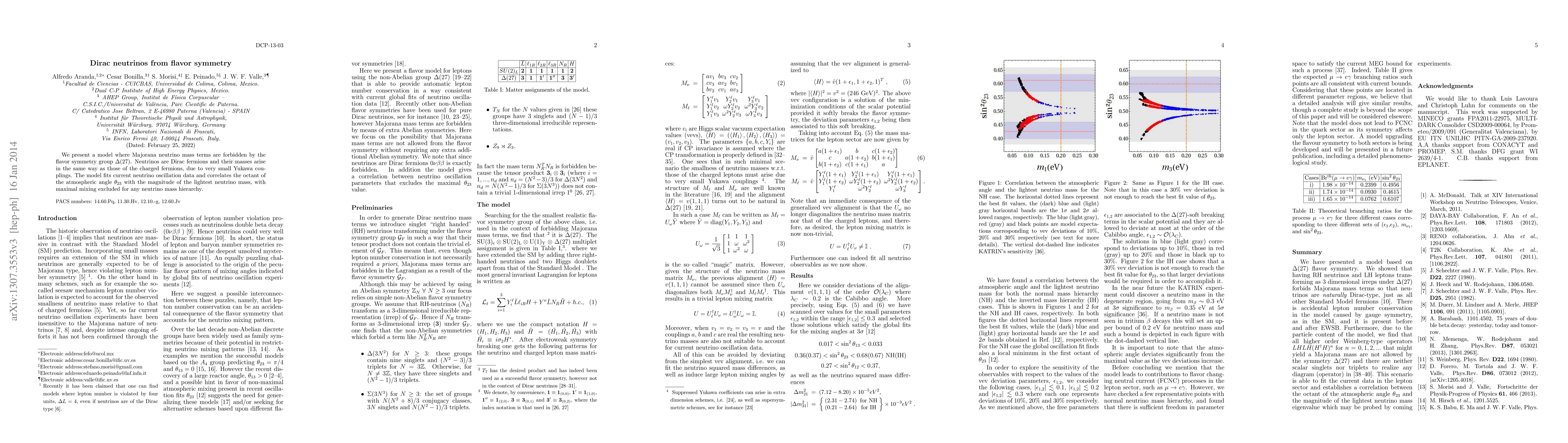 We present a model where Majorana neutrino mass terms are forbidden by the flavor symmetry group Delta(27). Neutrinos are Dirac fermions and their masses arise in the same way as that of the charged fermions, due to very small Yukawa couplings. The model fits current neutrino oscillation data and correlates the octant of the atmospheric angle with the magnitude of the lightest neutrino mass, with maximal mixing excluded for any neutrino mass