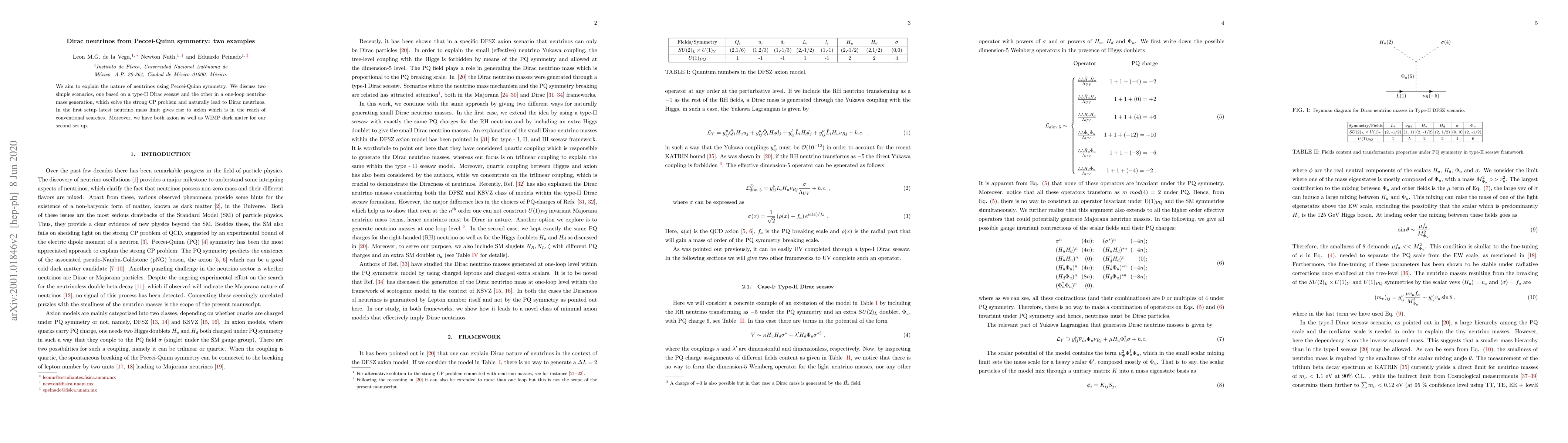 This paper explores two scenarios for explaining Dirac neutrinos using Peccei-Quinn symmetry: one employing a type-II Dirac seesaw and another involving one-loop mass generation. Both scenarios address the strong CP problem and result in naturally occurring Dirac neutrinos, with the first scenario predicting an axion detectable by conventional searches.