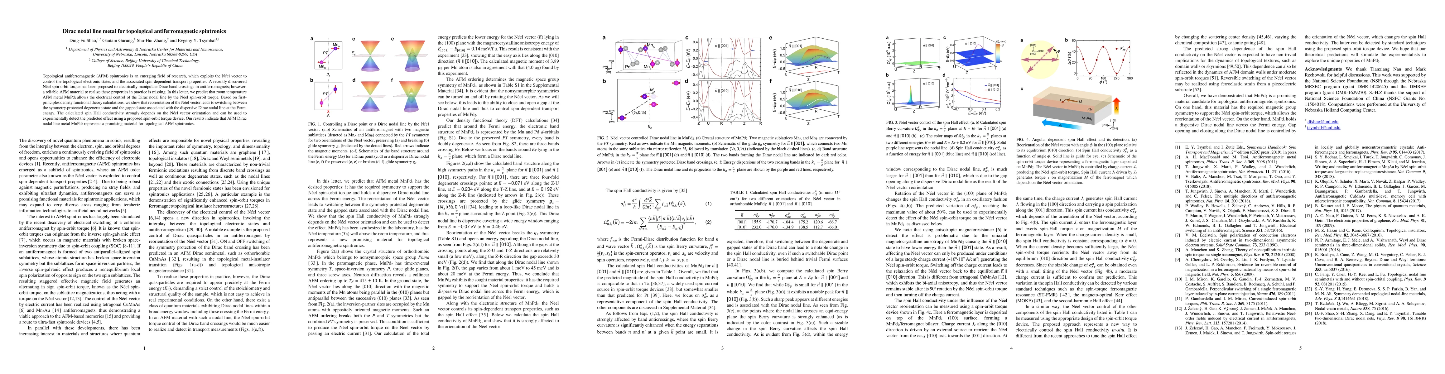 Topological antiferromagnetic (AFM) spintronics is an emerging field of research, which exploits the N\'eel vector to control the topological electronic states and the associated spin-dependent transport properties. A recently discovered N\'eel spin-orbit torque has been proposed to electrically manipulate Dirac band crossings in antiferromagnets; however, a reliable AFM material to realize these properties in practice is missing. Here, we predict that room temperature AFM metal MnPd$_{2}$ allows the electrical control of the Dirac nodal line by the N\'eel spin-orbit torque. Based on first-principles density functional theory calculations, we show that reorientation of the N\'eel vector leads to switching between the symmetry-protected degenerate state and the gapped state associated with the dispersive Dirac nodal line at the Fermi energy. The calculated spin Hall conductivity strongly depends on the N\'eel vector orientation and can be used to experimentally detect the predicted effect using a proposed spin-orbit torque device. Our results indicate that AFM Dirac nodal line metal MnPd$_{2}$ represents a promising material for topological AFM spintronics.