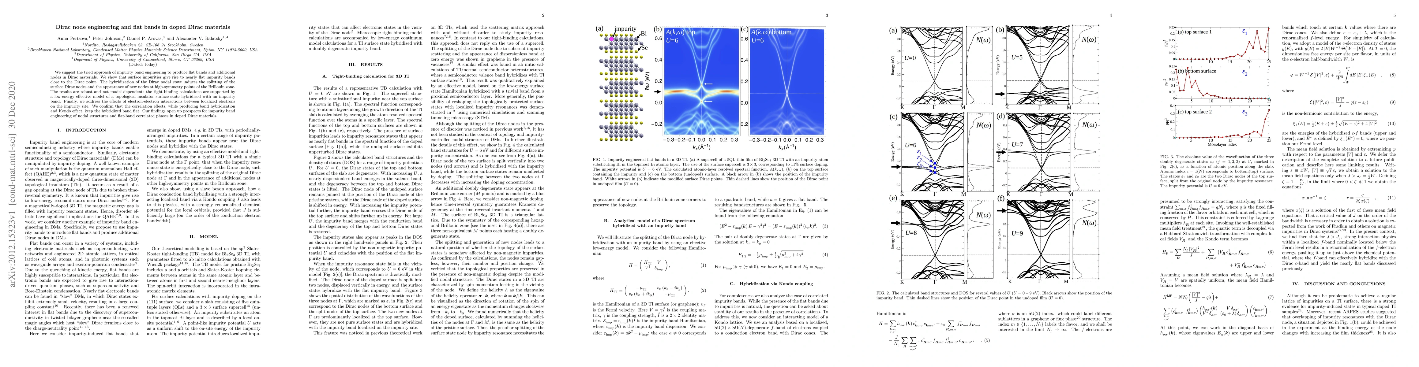 This paper explores impurity band engineering to create flat bands and additional nodes in doped Dirac materials, demonstrating that surface impurities induce nearly flat impurity bands near the Dirac point. The study confirms that these impurities can split surface Dirac nodes and generate new nodes, with results supported by both tight-binding calculations and a low-energy effective model.