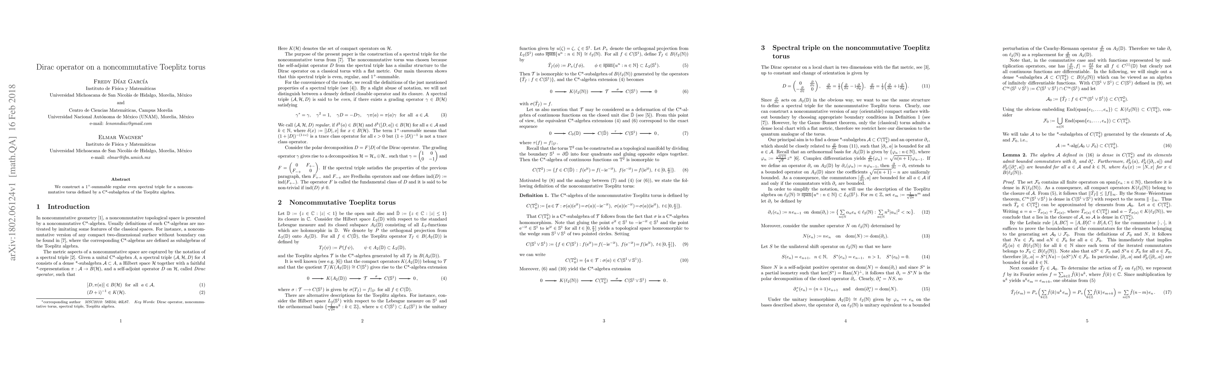We construct a 1+ summable regular even spectral triple for a noncommutative torus defined by a C*-subalgebra of the Toeplitz algebra.