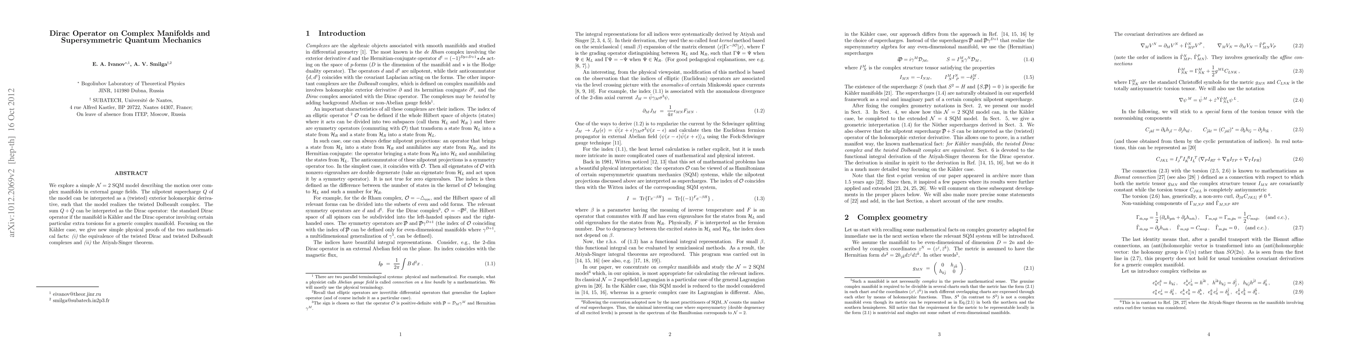 We explore a new simple N=2 SQM model describing the motion over complex manifolds in external gauge fields. The nilpotent supercharge Q of the model can be interpreted as a (twisted) exterior holomorphic derivative, such that the model realizes the twisted Dolbeault complex. The sum Q + \bar Q can be interpreted as the Dirac operator: the standard Dirac operator if the manifold is K\"ahler and a certain "truncated" Dirac operator for a generic complex manifold. Focusing on the K\"ahler case, we give new simple physical proofs of the two mathematical facts: (i) the equivalence of the twisted Dirac and twisted Dolbeault complexes and (ii) the Atiyah-Singer theorem.