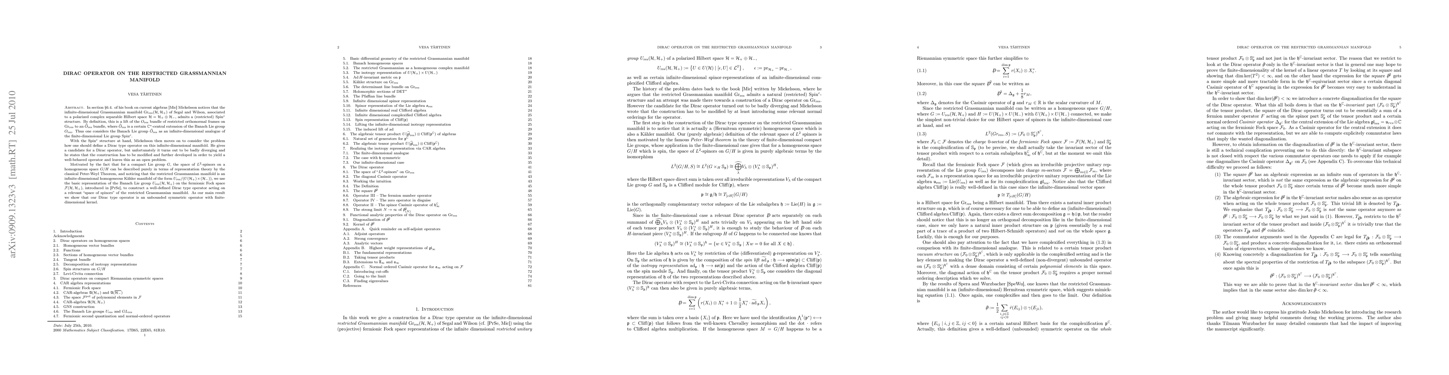 Researchers developed a well-defined Dirac operator on the restricted Grassmannian manifold, an infinite-dimensional space studied in physics, showing it's an unbounded symmetric operator with finite-dimensional kernel.